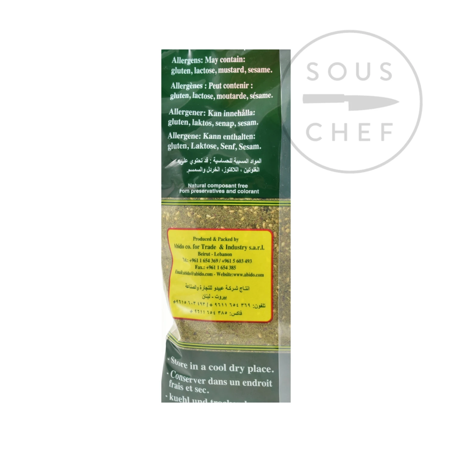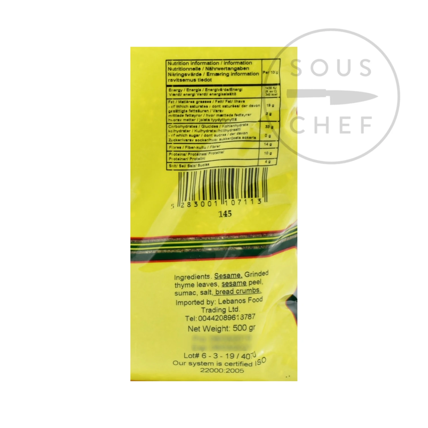 Ingredients: Sesame, Grinded thyme leaves, sesame peel, sumac, salt, bread crumbs (wheat). Allergens listed in bold. May contain lactose and mustard.