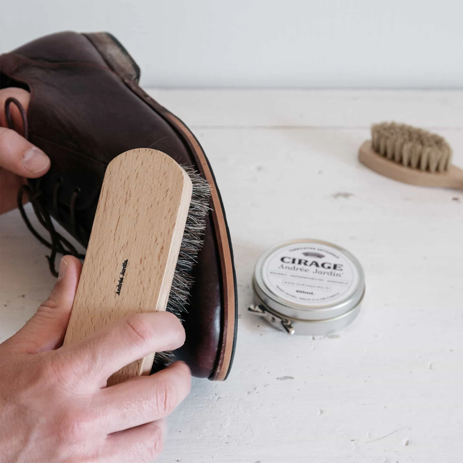 Andree Jardin’s horsehair shoe polishing and buffing brush is a soft brush for bringing a new shine to leather shoes. Use it with the beeswax polish, and hog bristle application brush for a natural way to spruce up your footwear.