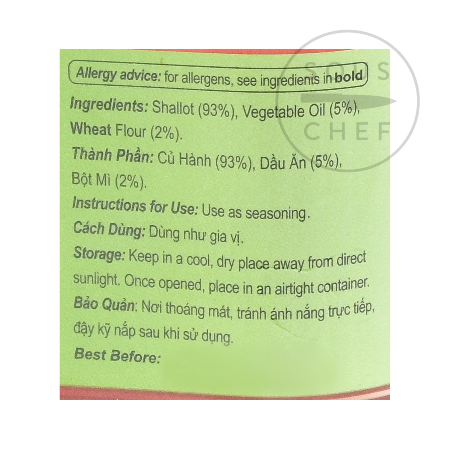 Ingredients: Shallots 93%, vegetable oil (5%), wheat flour (2%).