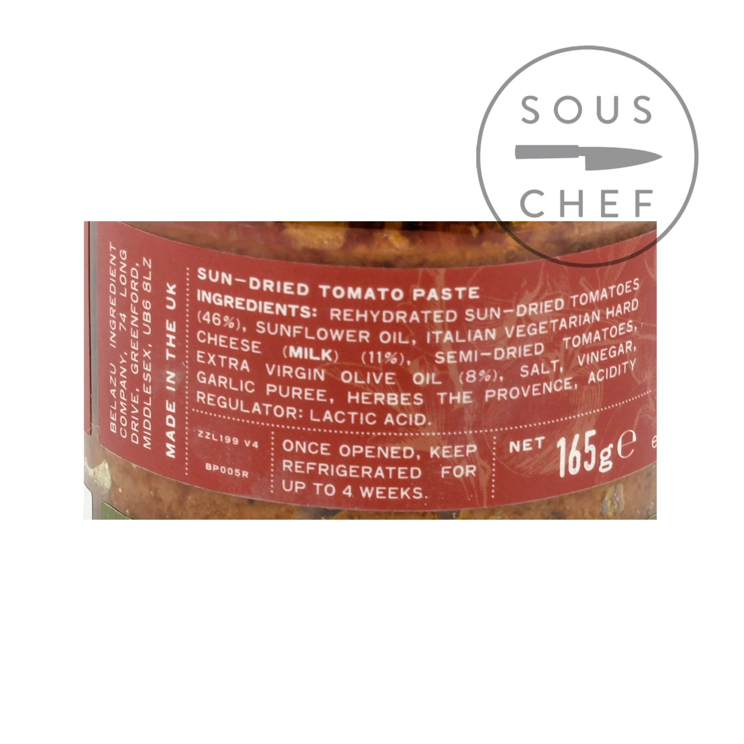 Ingredients: Rehydrated sun-dried tomatoes (46%), sunflower oil, Italian vegetarian hard cheese (milk) (11%), semi-dried tomatoes, extra virgin olive oil (8%), salt, vinegar, garlic purée, herbes de Provence, acidity regulator: lactic acid.
