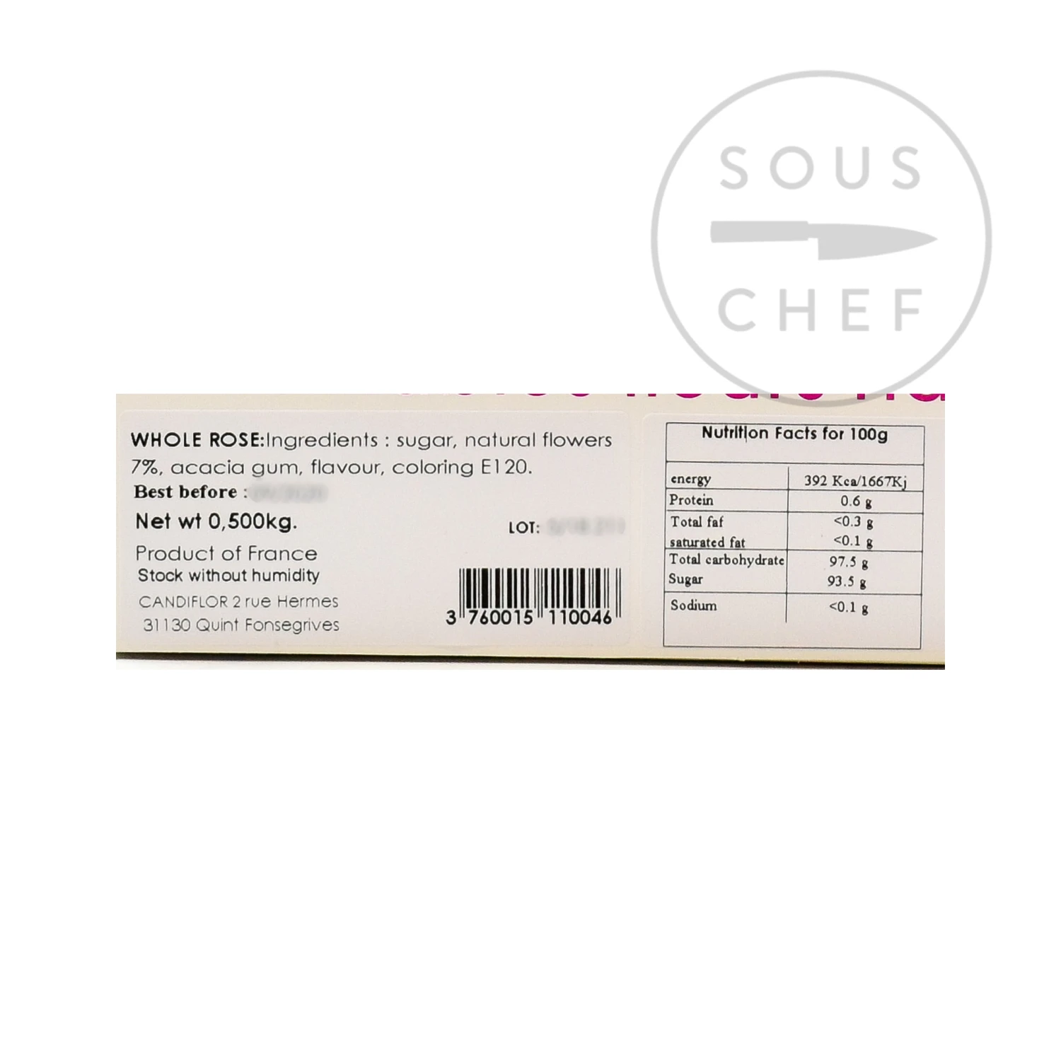 Ingredients: sugar (91%), natural roses flower (7%), gum arabic (2%), food colouring: E120, aroma.