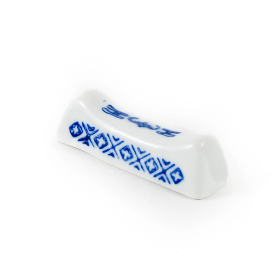 The white porcelain chopstick rest has a translucent ‘rice grain’ pattern. A blue painted design decorates the sides. A Chinese classic.