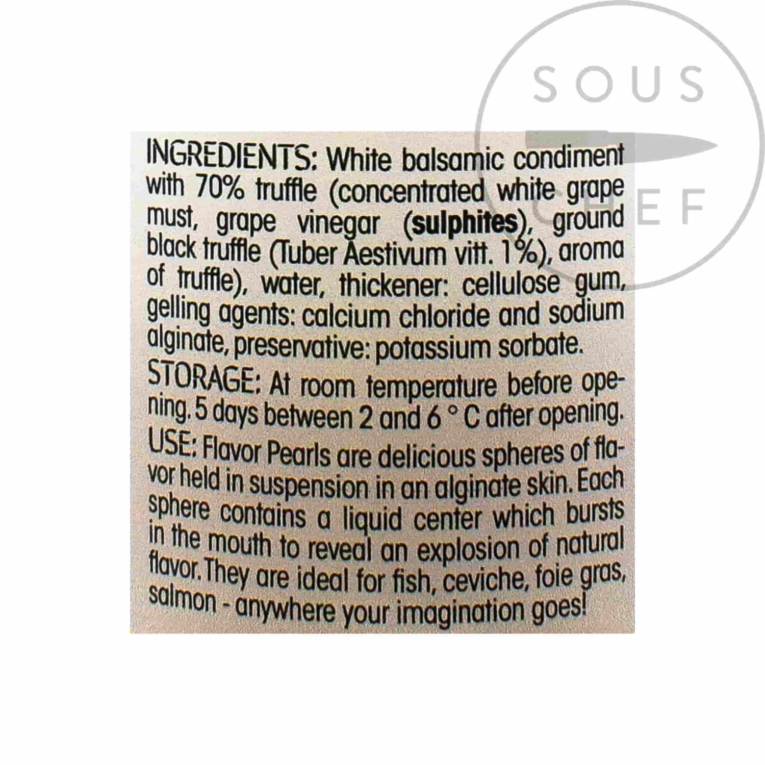 Ingredients: White balsamic condiment with 70% truffle (concentrated white grape must, grape vinegar (sulphites), ground black truffle (Tuber Aestivum vitt. 1%), aroma of truffle), water, thickener: cellulose gum, gelling agents: calcium chloride and sodium alginate, preservative: potassium sorbate.Â