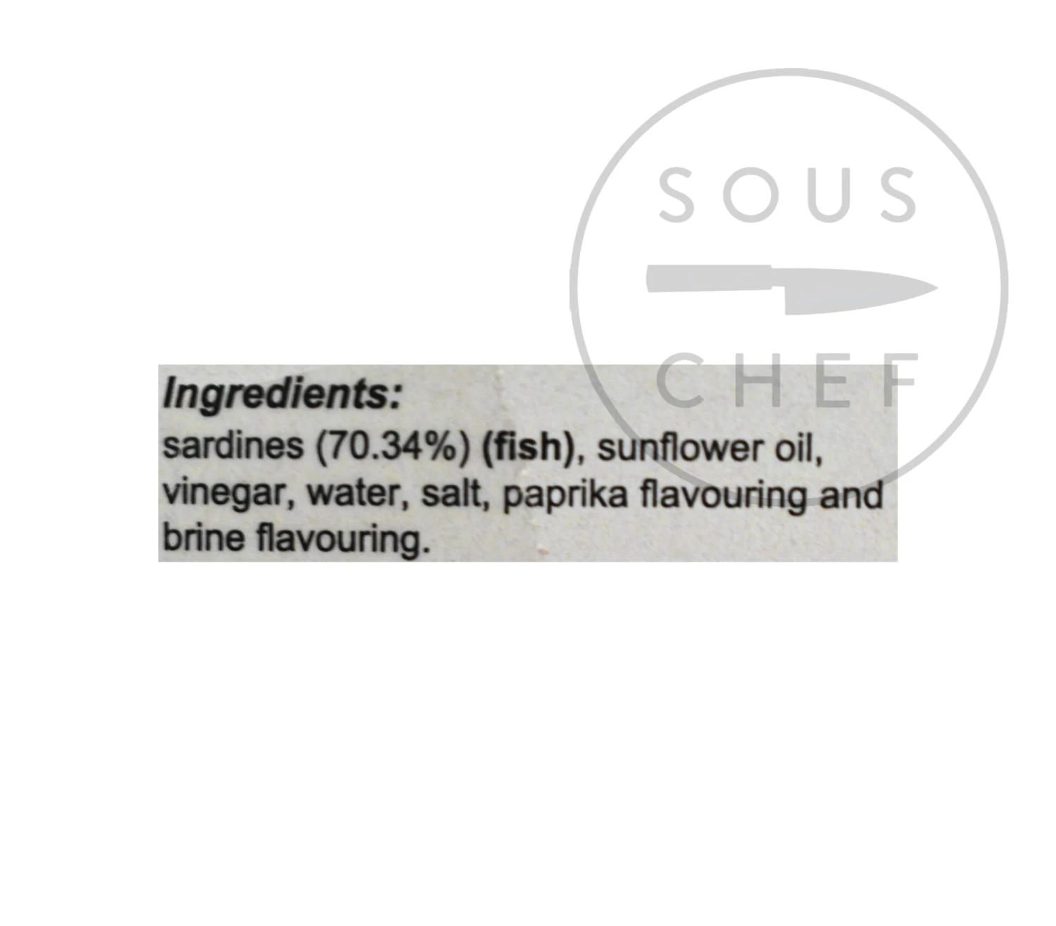 Ingredients: Sardines (70.34%) (fish), sunflower oil, vinegar, water, salt, paprika flavouring and brine flavouring.