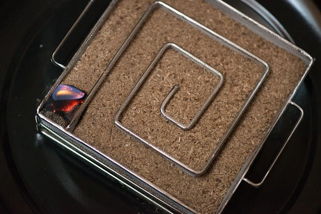 Next, fill the smoking tray with the oak wood dust, and light the corner. The smoke will wind its way through the maze over the course of ten hours, releasing a steady stream of smoke. Add spices or herbs, or use different flavoured wood dust to scent the smoke and pair it with specific foods. Try everything from haddock, to home-smoked salmon, bacon, brisket, ribs and cheeses.Â
