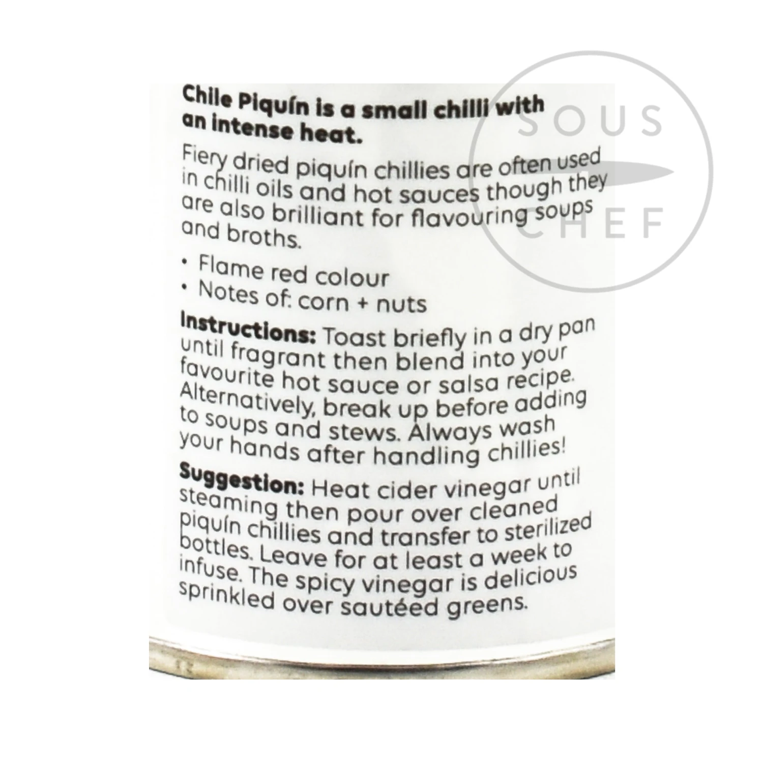 Piquin chillies have a citrus spiciness, and bitter chocolate notes. They add heat and depth to tomato sauces and red meat marinades – their size and strength also make them a good ingredient for infusing oils and vinegars.