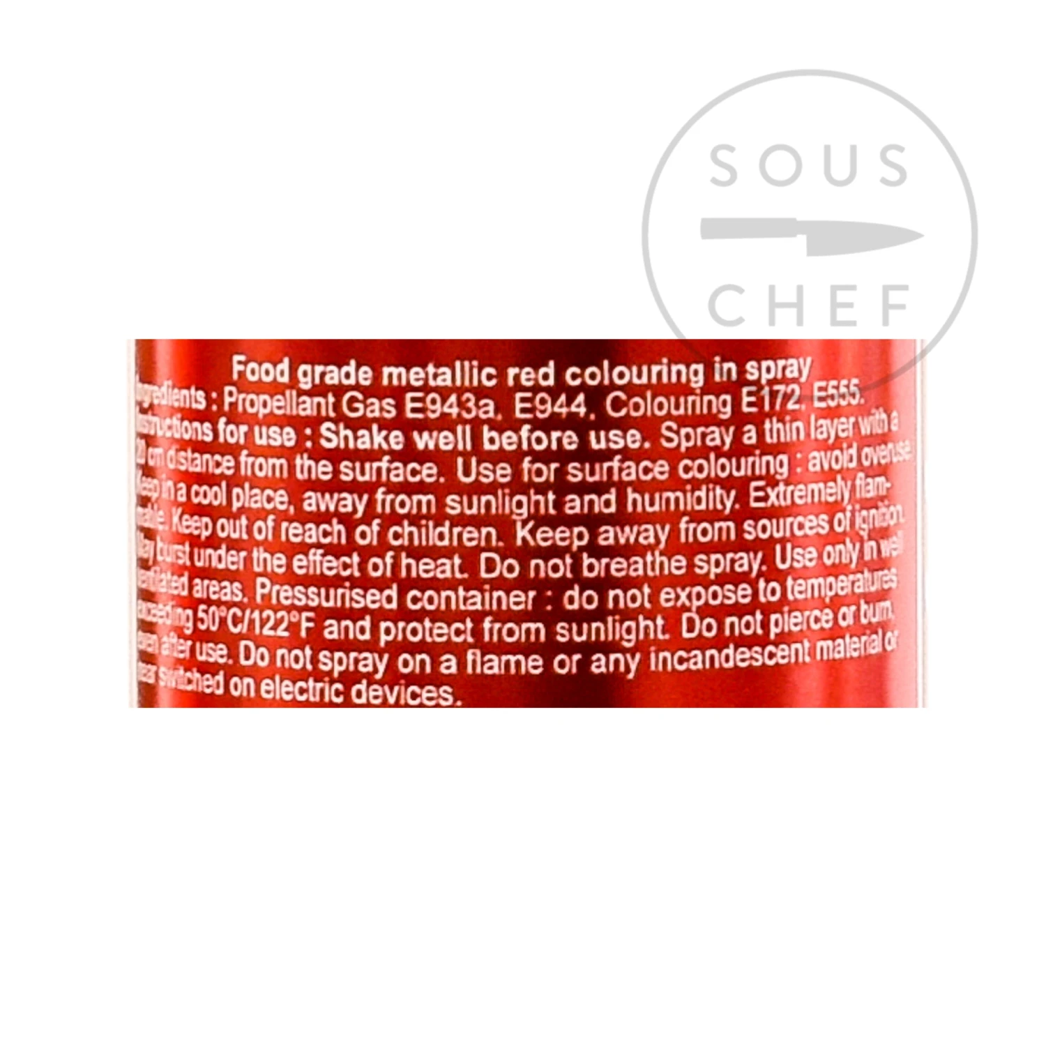 This edible metallic red spray brings a flawless metallic red coating to desserts, chocolates, icing and cakes. Use the edible metallic red food colouring spray can to create a fine metallic red finish on any patisserie. The metallic red finish looks spectacular – try adding a touch of glamour to a red velvet cake or to a batch of macarons.