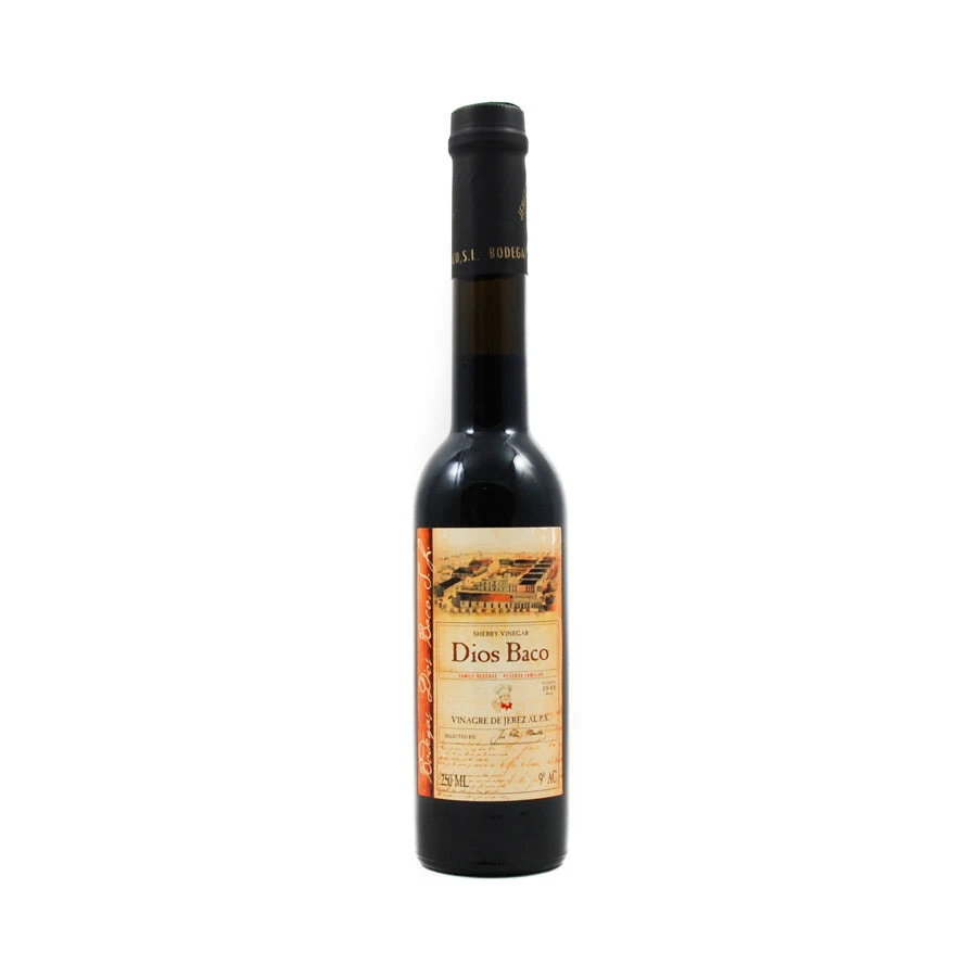 Dios Baco sherry vinegar with Pedro Ximenez is a sharp sherry vinegar that is balanced with the addition of Pedro Ximenez – an intensely dark and sweet Spanish sherry. The Dios Baco sherry vinegar is aged for around 12 years with the Pedro Ximenez adding richness to the vinegar during this process. Use the Dios Baco sherry vinegar with Pedro Ximenez in a similar way to balsamic vinegar – in salad dressings, as a glaze or over figs and cured ham.