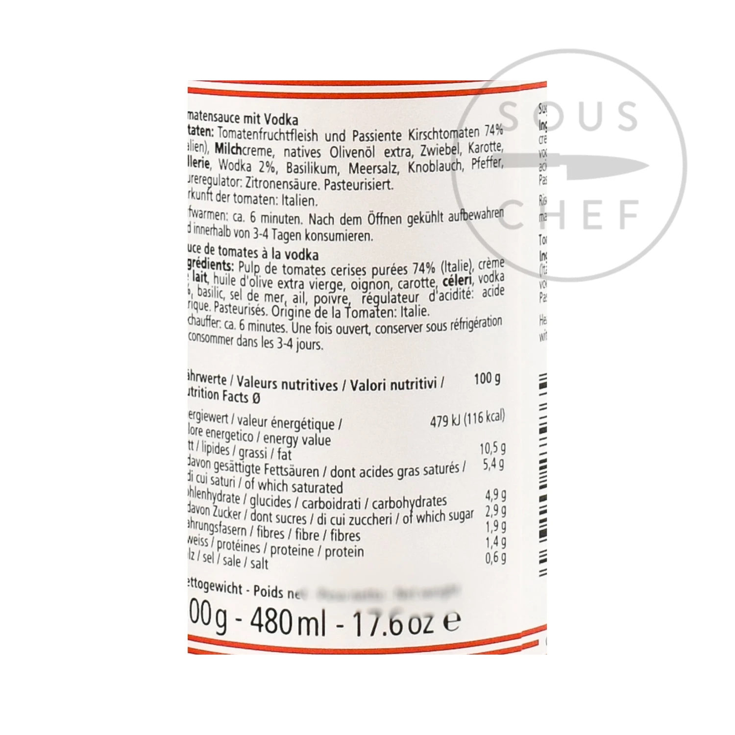 Ingredients: pulp of tomato and cherry tomato puree (74%), cream of milk, extra virgin olive oil, onion, carrot, celery, vodka (2%), basil, sea salt, garlic, pepper, acidifier: citric acid. Pasteurised. Allergens are listed in bold.