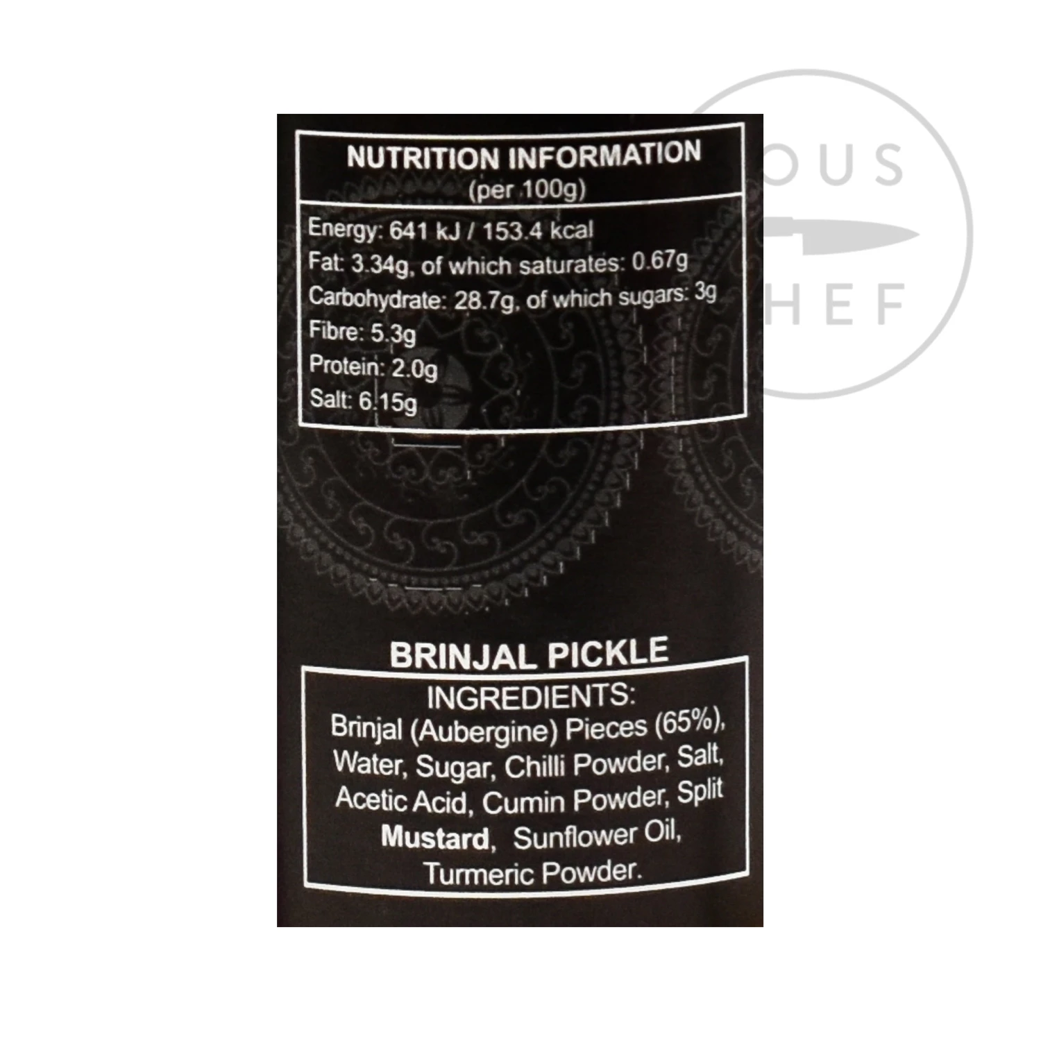 Ingredients: Brinjal (aubergine) pieces 65%, sugar, water, sunflower oil, chilli, salt, acetic acid, mustard, cumin powder, turmeric powder. Contains mustard.
