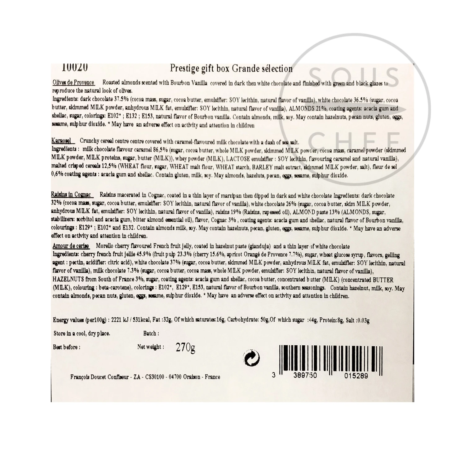 Ingredients: Olives of Provence: 37.5% Dark chocolate (cocoa paste, sugar, cocoa butter, emulsifier: soya lecithin, natural vanilla flavour), 36.5% white chocolate (sugar, cocoa butter, skimmed milk powder, anhydrous milk fat, emulsifier: soya lecithin, natural vanilla flavour), ALMONDS 21%, coating agents: acacia gum and shellac, sugar, colorants: E102 *; E132; E153, natural aroma of Bourbon vanilla. Cherry Love: 42.7% White chocolate (sugar, cocoa butter, skim milk powder, anhydrous milk fat, emulsifier: soya lecithin, natural vanilla flavour), cherry fruit paste 42.6% (fruit pulp 23 % (cherry 16%, apricot Orangé de Provence 7%), sugar, wheat glucose syrup, flavourings, gelling agent: pectin, acidifier: citric acid), milk chocolate 6.7% (sugar, cocoa butter, sugar paste) cocoa, MILK whole powder, emulsifier: soya lecithin, natural vanilla flavour), nuts from the South of France 3%, sugar, cocoa butter, coating agents: acacia gum and shellac, butter (milk) concentrated butter (milk) concentrate, colouring: beta-carotene), colouring: E102 *, E129 *, E153, natural Bourbon vanilla flavour, Provence herbs .Cognac Grapes:  32% Dark chocolate (cocoa mass, sugar, cocoa butter, emulsifier: soya lecithin, natural vanilla flavour), 26% white chocolate (sugar, cocoa butter, skimmed milk powder, anhydrous milk fat, emulsifier: soya lecithin, natural vanilla flavour), raisins 19% (grapes, rapeseed oil), almond paste 13% (almonds, sugar, stabilizers: sorbitol and acacia gum, bitter almond essential oil ), aroma, Cognac 3%, coating agents: acacia gum and shellac, natural Bourbon vanilla flavour, colors: E129 *; E102 *; E132. Karaosel: caramel flavoured milk chocolate 86.5% (sugar, cocoa butter, skimmed milk powder, cocoa mass, caramel powder (milk  skimmed powder, milk protein, sugar, butter (milk )), whey in powder (milk ), lactose, emulsifier: soya lecithin, caramel flavour and natural vanilla), crumbly malted cereals 12.5% ​​(BLE flour, sugar, malted wheat flour, BLE starch, barley malt extract, skim milk, salt), fleur de sel 0.6%, coating agents: acacia gum and shellac.