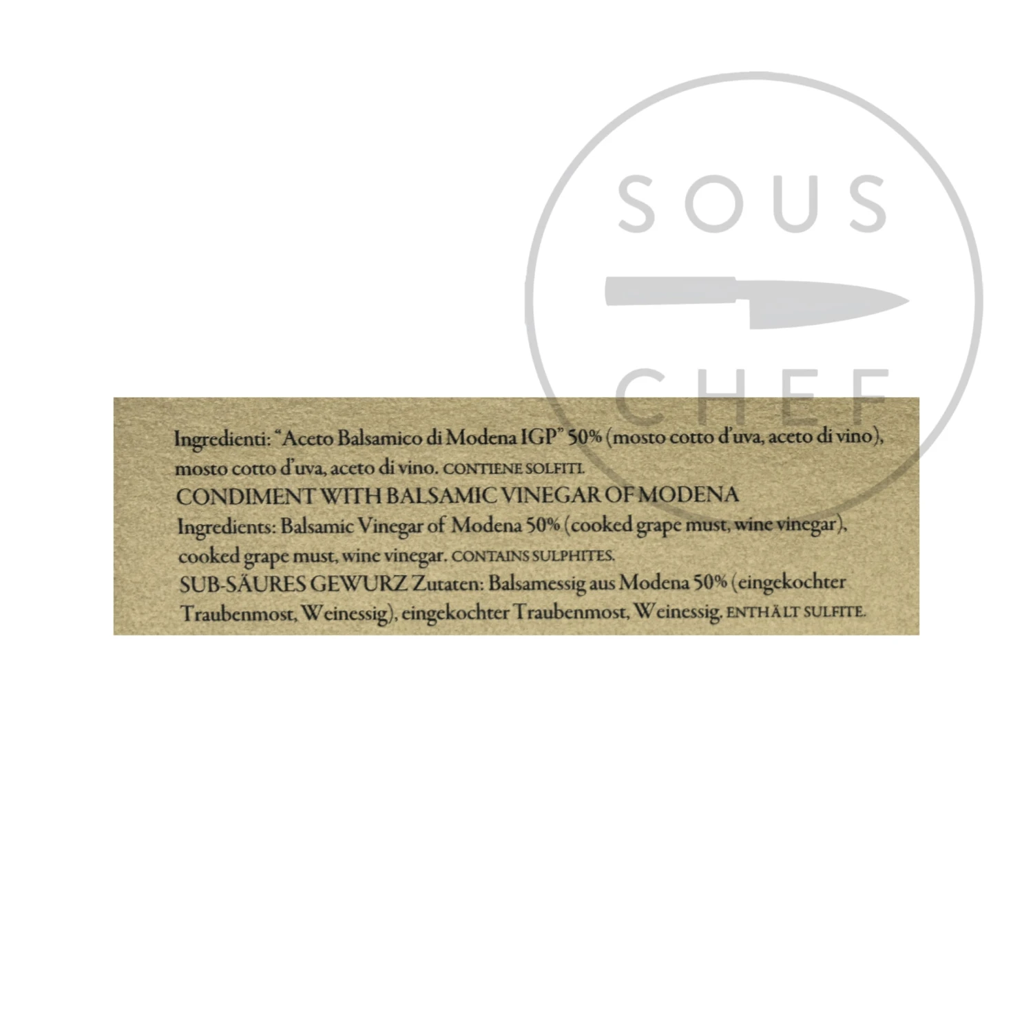 Ingredients: Balsamic vinegar of Modena 50% (cooked grape must, wine vinegar), cooked grape must, wine vinegar. Contains sulphites.