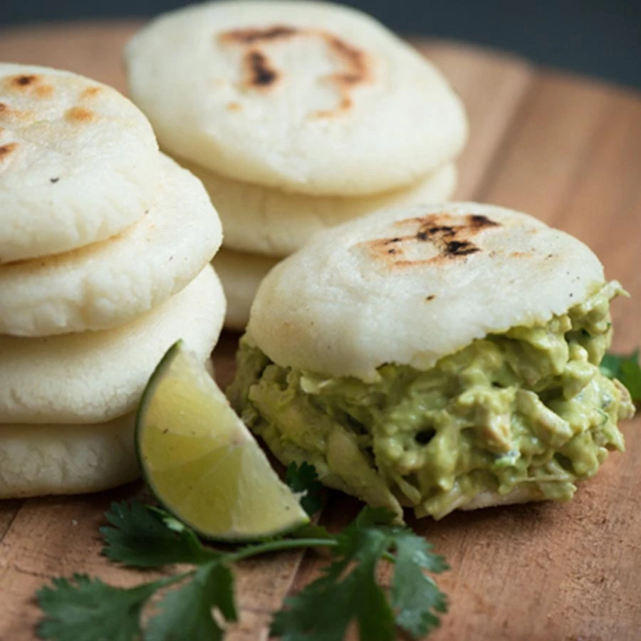 An arepa is a grilled cornflour or cornbread ‘bun’, and they’re popularly served as breakfast and street food. Once cooked, they’re split in half to hold fillings. Classic fillings include Reina Pepiada – chicken with avocado, mayonnaise & red onion, shredded beef, cheese, or even just a bit of butter!