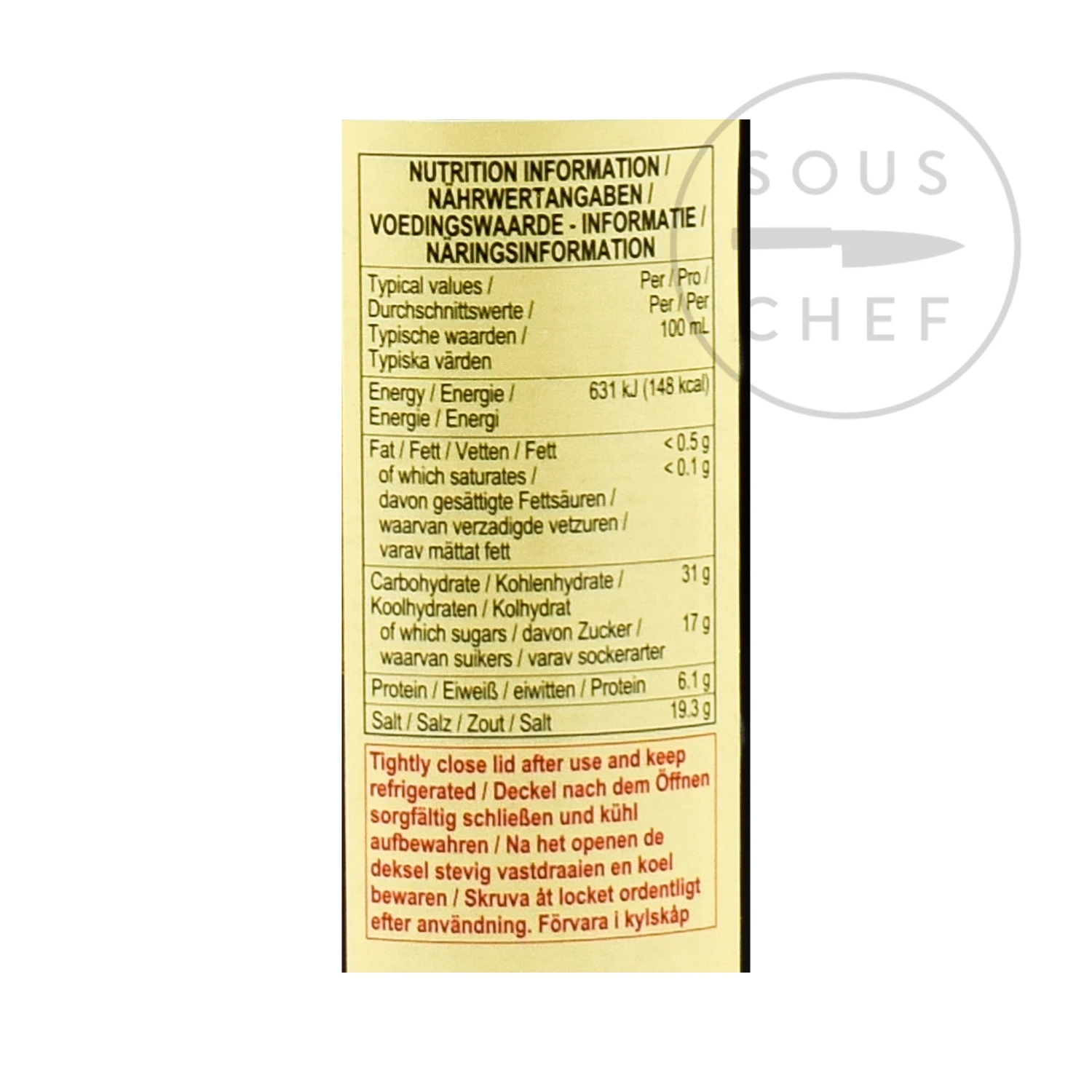 Ingredients: Soy sauce (30%) (water, soybean, salt, wheat flour), colours: e150a, e150c; sugar, salt. Allergens are listed in bold.