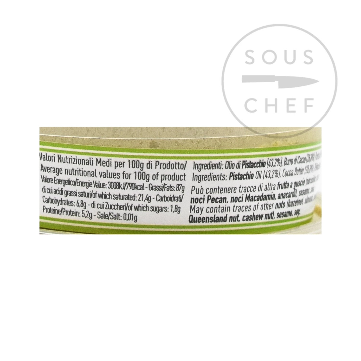 Ingredients: pistachio oil (43.2%), cocoa butter (28.8%), pistachio paste (28%). Allergens are listed in bold. May contain traces of sesame, soy, and milk.