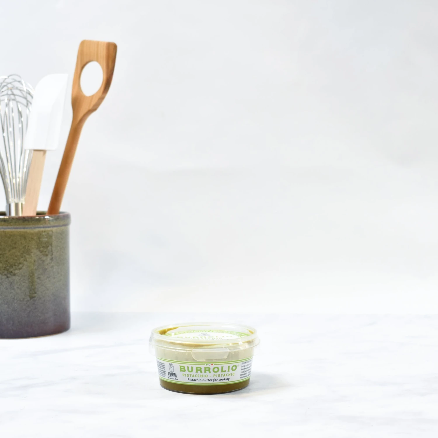 Pariani Burrolio pistachio butter is a natural vegan alternative to butter and cooking fats with a distinctive pistachio flavour. The spread is made from just two ingredients: pistachios and cocoa butter. The texture is just like dairy butter, but is dairy-free, gluten free, lower in cholesterol and has a great pistachio flavour.