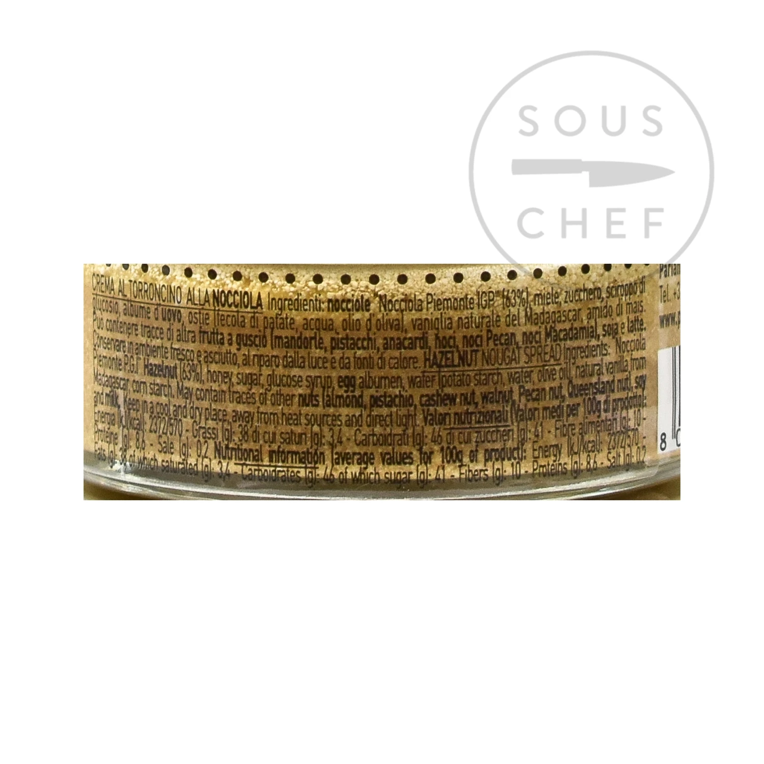 Ingredients: “Nocciola Piemonte IGP” hazelnuts (63%), honey, sugar, glucose syrup, egg albumen, wafer (potato starch, water, olive oil), natural vanilla from Madagascar, corn starch. Contains allergens: nuts, egg. May contain traces of other nuts, soy and milk.