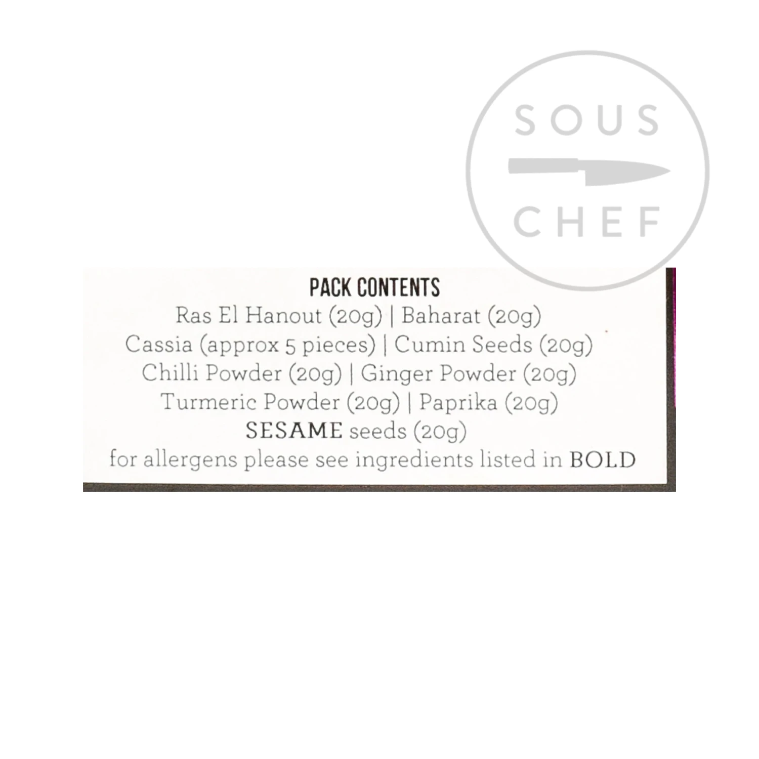- Ras el Hanout 20g– warm, aromatic blend of cumin, coriander, cinnamon, ginger, black pepper, turmeric and cardamom