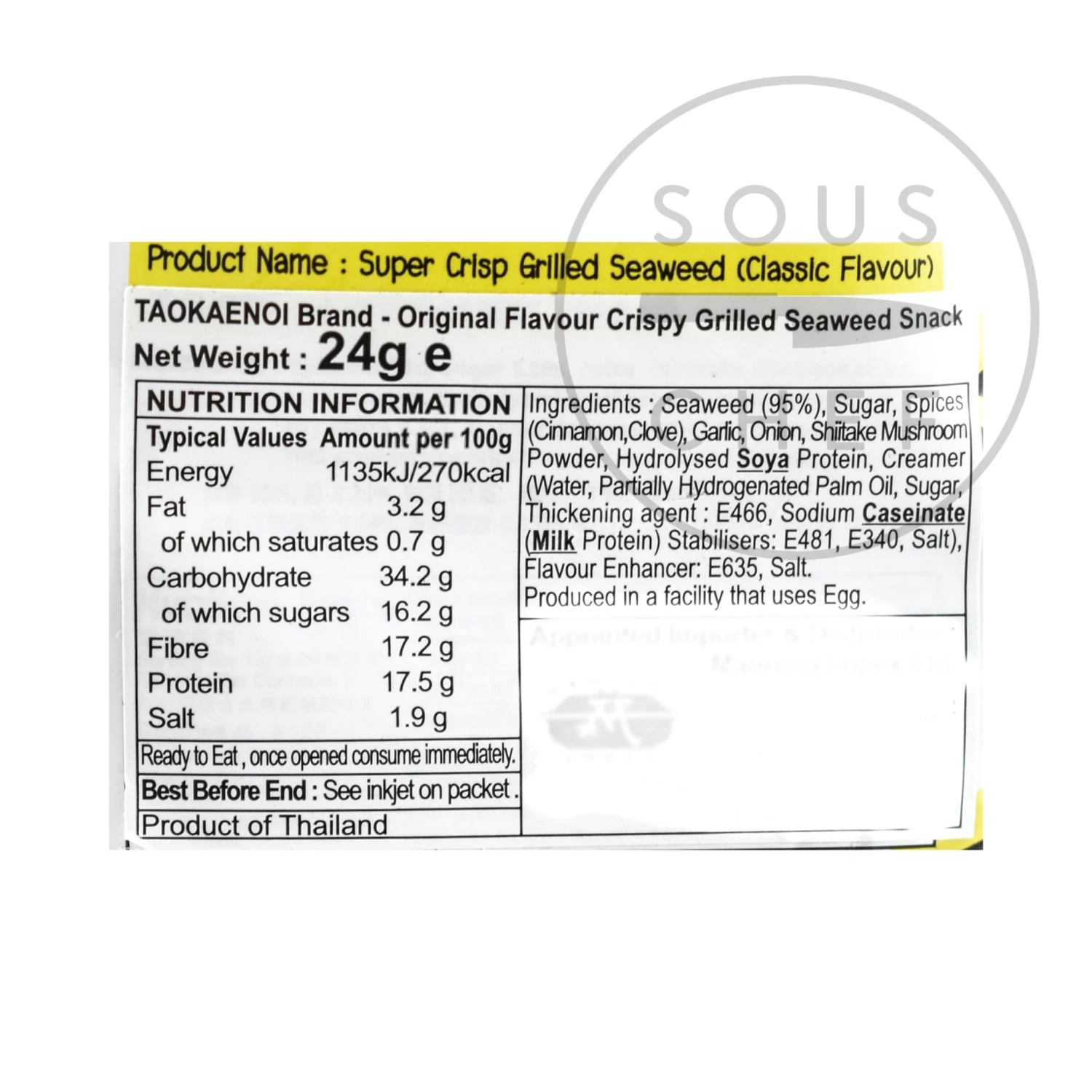Ingredients: Seaweed (95%), Sugar, Spices (Cinnamon, Clove), Garlic, Onion, Shiitake Mushroom Powder, Hydrolysed Soya Protein, Creamer (Water, Partially Hydrogenated Palm Oil, Sugar, Thickening agent: E466, Sodium Caseinate (Milk Protein), Stabilisers: E481, E340, Salt), Flavour Enhancer: E635, Salt.