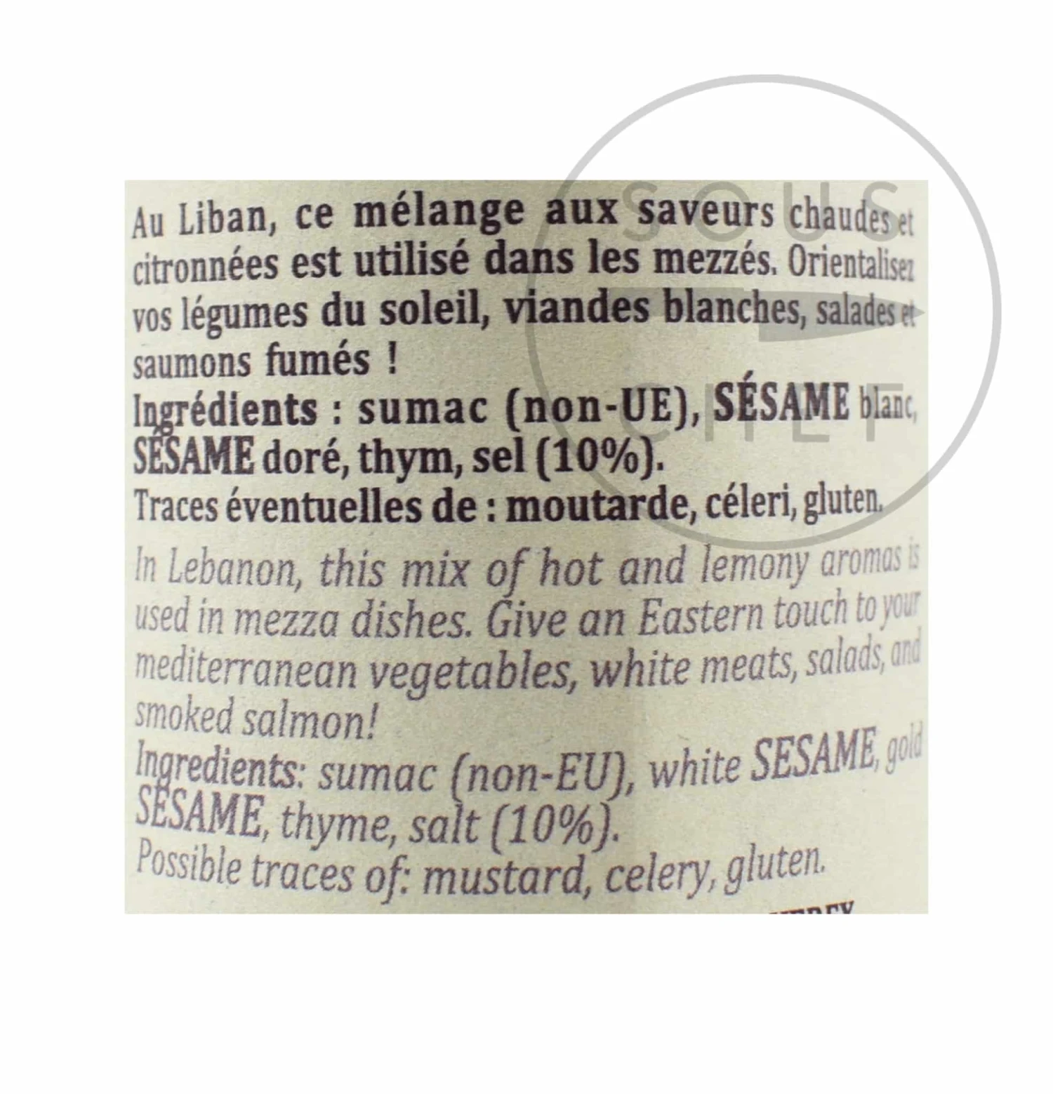 Ingredients: sumac (non EU), white sesame, gold sesame, thyme, salt (10%).