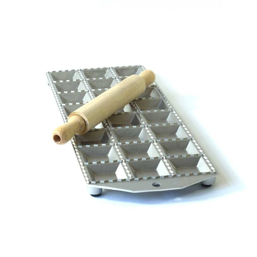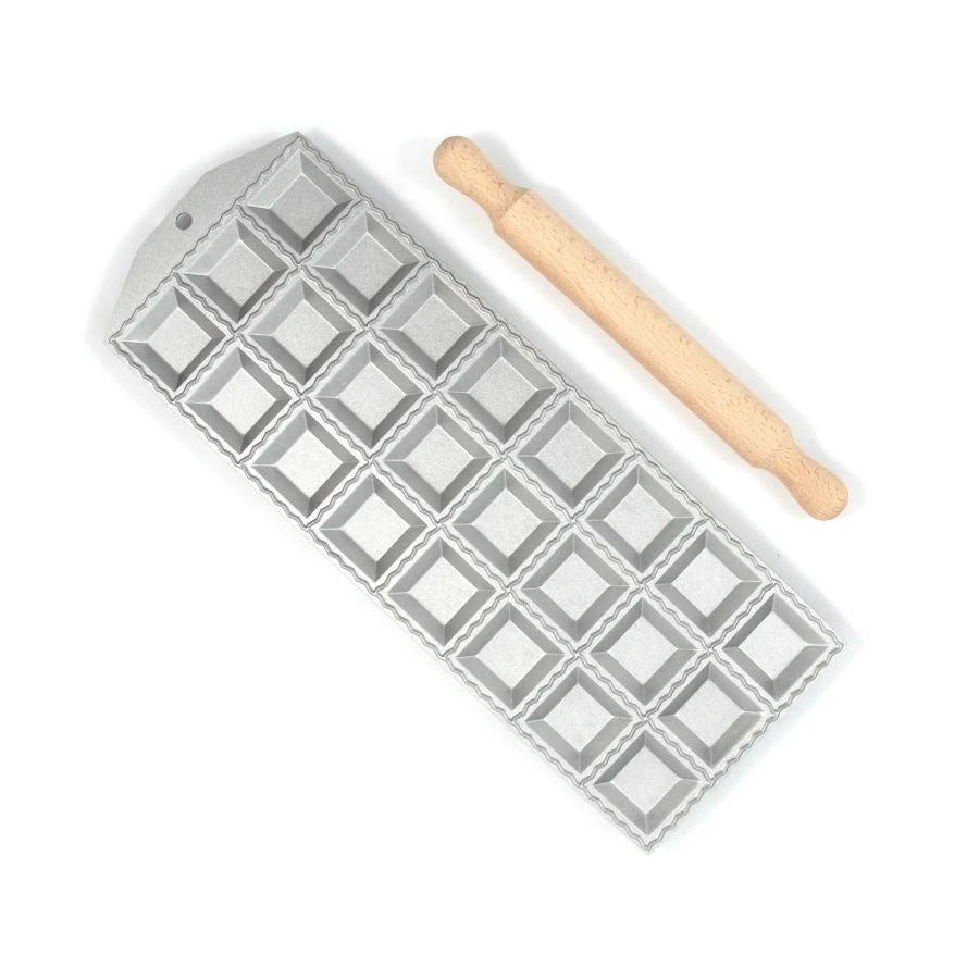 Make fresh, home-made ravioli with this large 24-square ravioli tray and rolling pin set. Lay down one sheet of pasta and gently press into the squares. Fill with mushroom or goat’s cheese, lobster, pumpkin, or any other homemade filling – and then place another pasta sheet on top. Use the rolling pin to press together the parcels and and separate into individual ravioli.