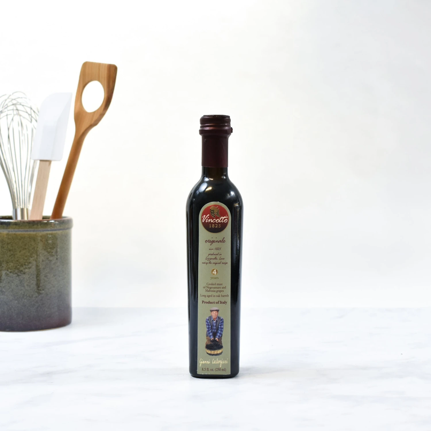 Vincotto, or vino cotto, is a dark, sweet syrup used to cook and also to finish dishes. Literally translating as ‘cooked wine’, it is made by slowly cooking and reducing grape must, then aging the liquid in oak barrels. This caramalizes the sugars and creates sweet, raisin notes. Drizzle over salads, meats, goats cheese and cooked fruit. Also use in rich marinades, or to deglaze pans.