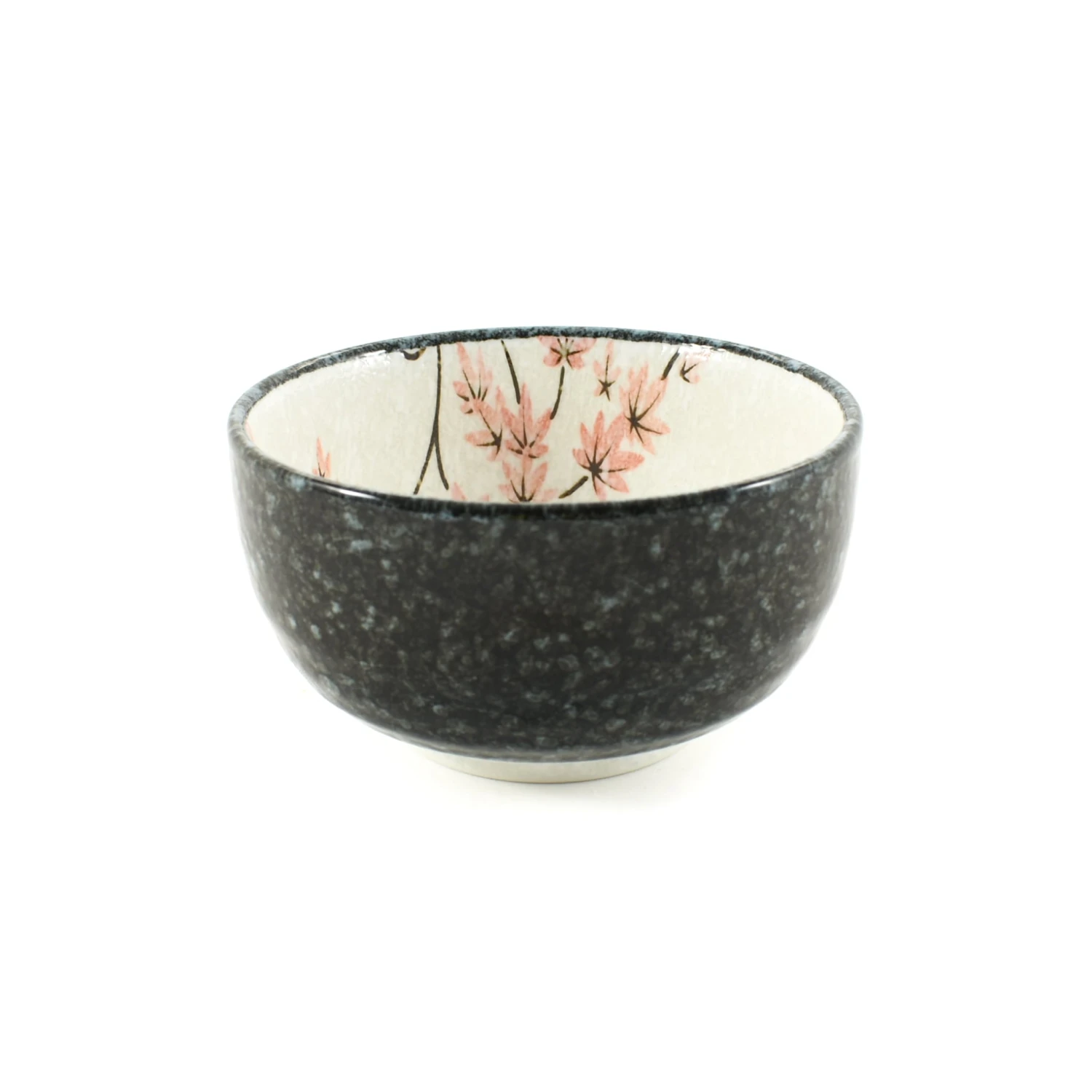 This delicate bowl is decorated with a speckled slate grey pattern on the outside, and pale pink floral pattern on the inside.Â