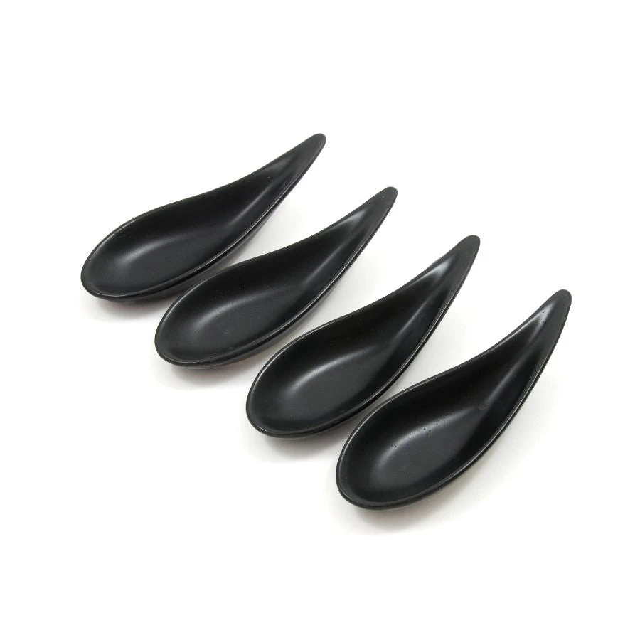 These elegant curved porcelain canapé‎ spoons are perfect for serving individual spoons of ceviche, mousses, or a morsel of pan-seared fish with romanesco sauce. Elegant and hard wearing the curved porcelain canapé‎ dishes work beautifully presented on black slate (sold separately).