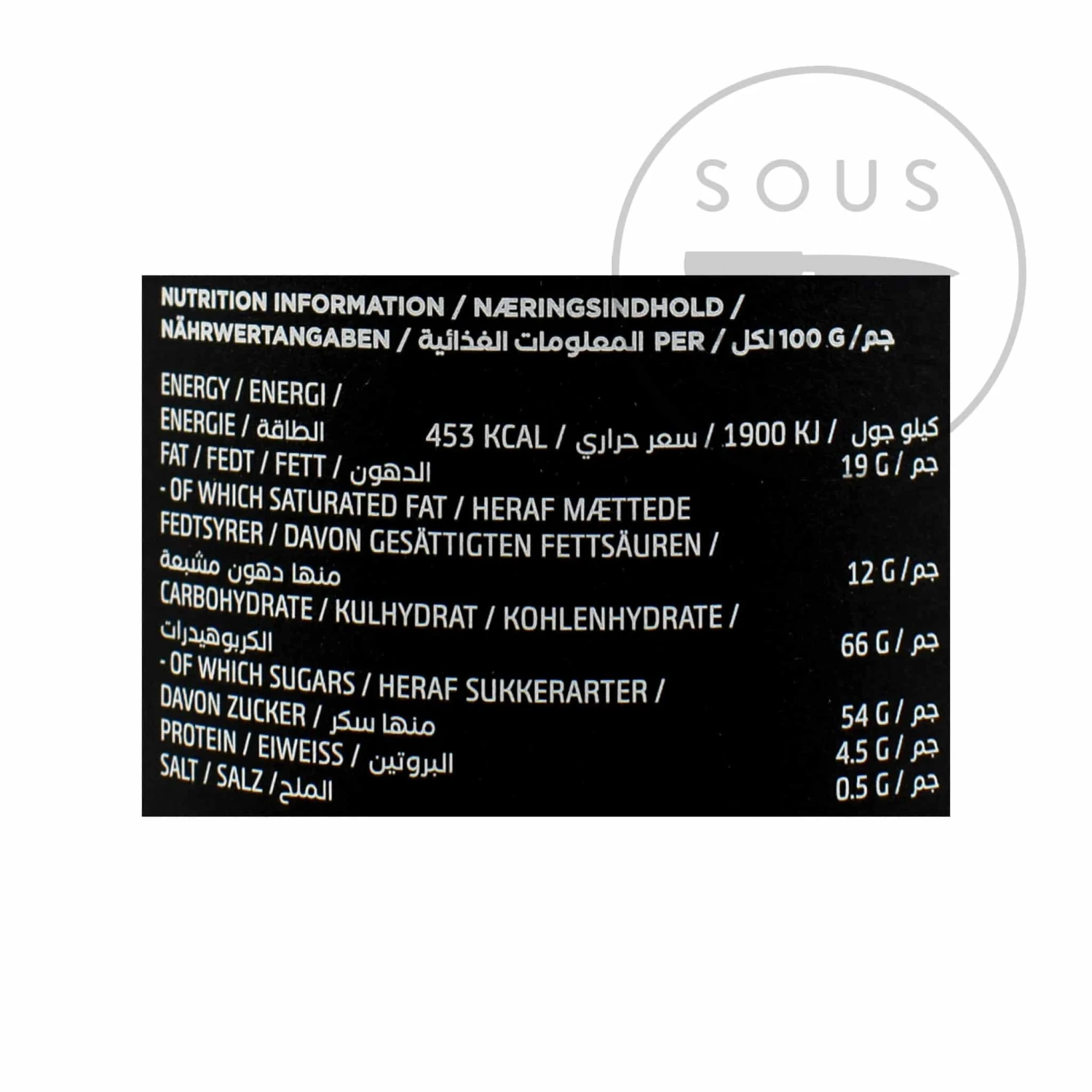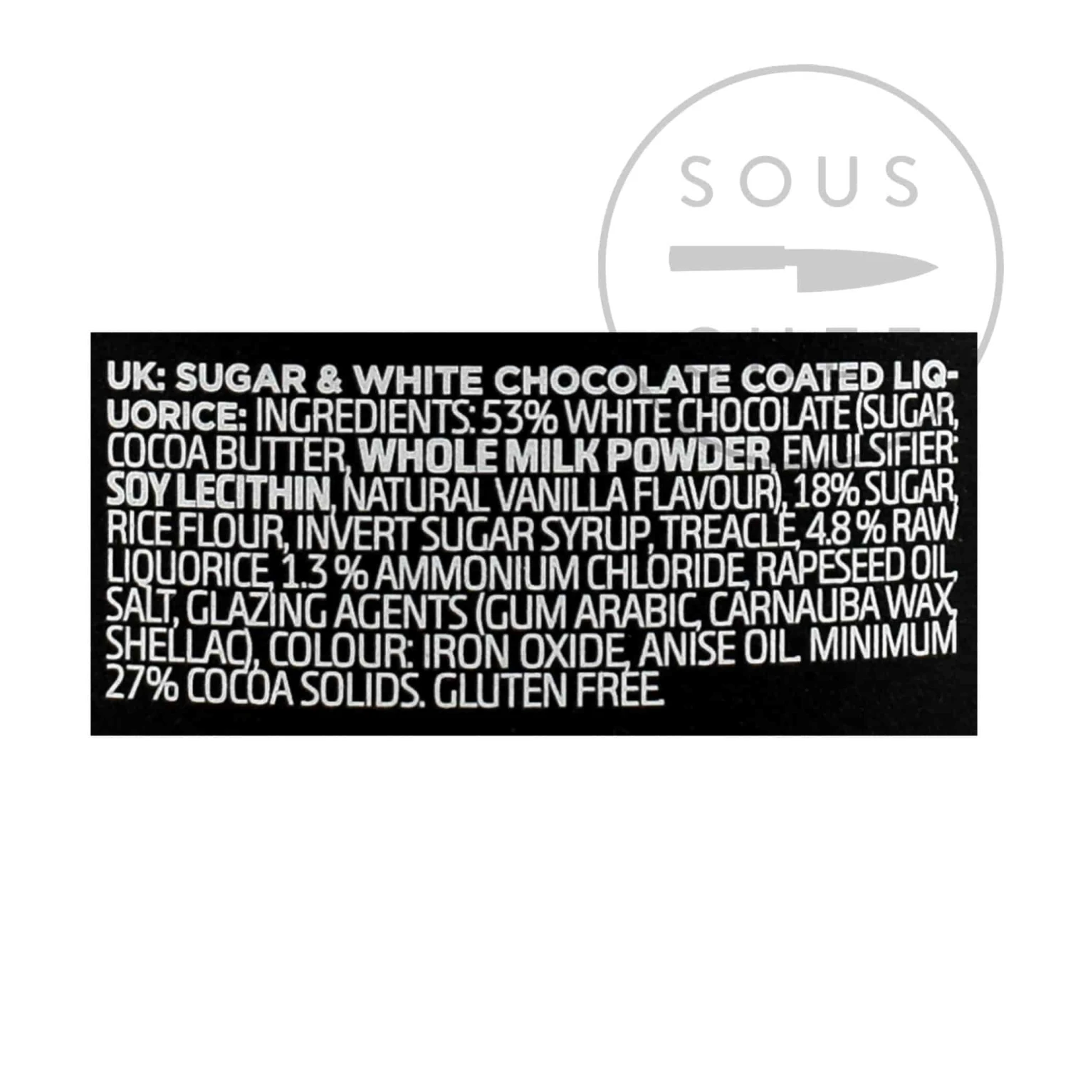 Ingredients: 53% white chocolate (sugar, cocoa butter, whole milk powder, emulsifier: soy lecithin, natural vanilla flavour), 18% sugar, rice flour, invert sugar syrup, treacle, 4.8% raw liquorice, 1.3% ammonium chloride, rapeseed oil, salt, glazing agents (gum arabic, carnauba wax, shellac), colour: iron oxide, anise oil. Minimum 27% cocoa solids. Gluten free.