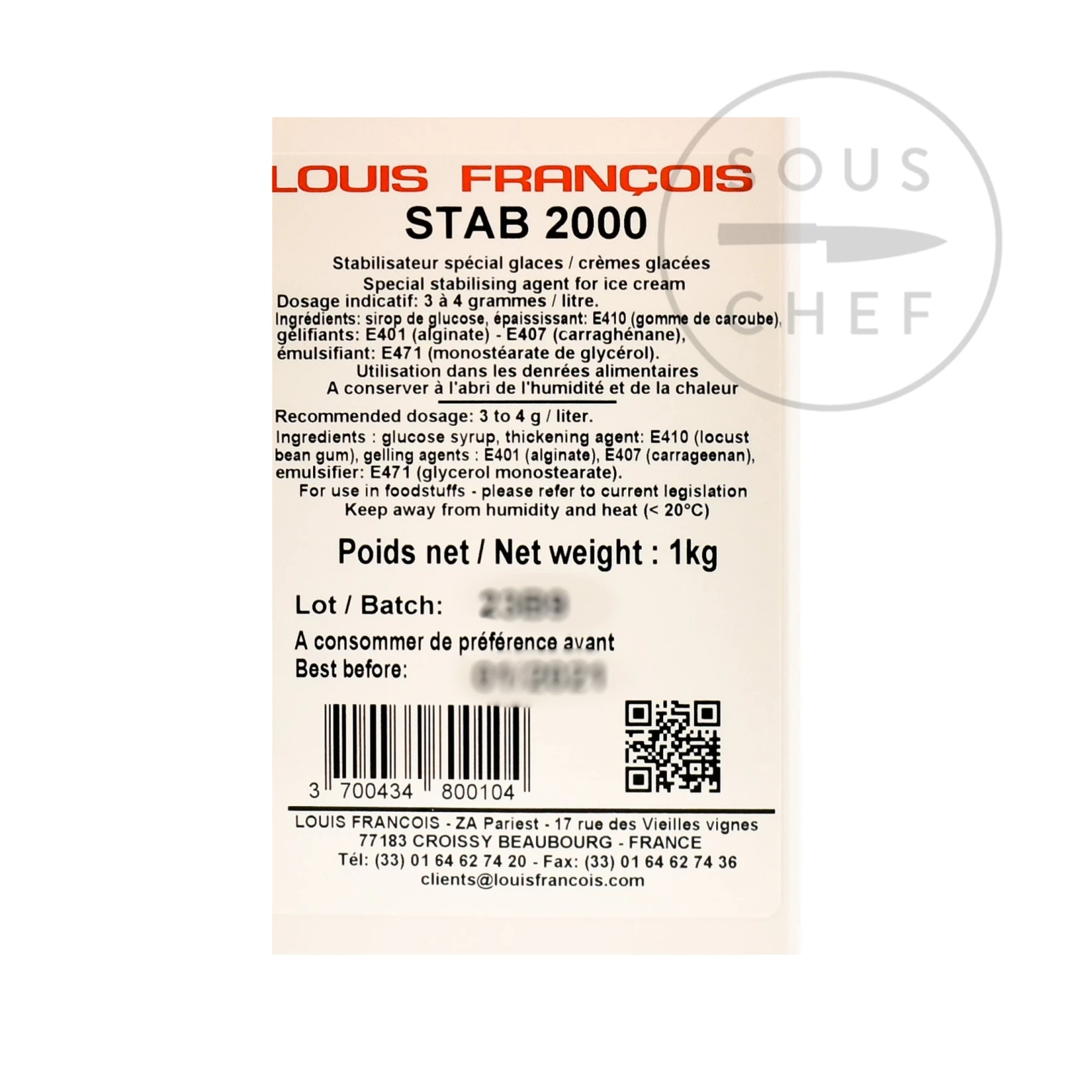 Louis Francois stab 2000 is an ice cream stabiliser, that is designed to delay crystals forming as ice cream freezes. This ensures a smooth texture and softer scoop. It also helps increase volume, and slows melting.