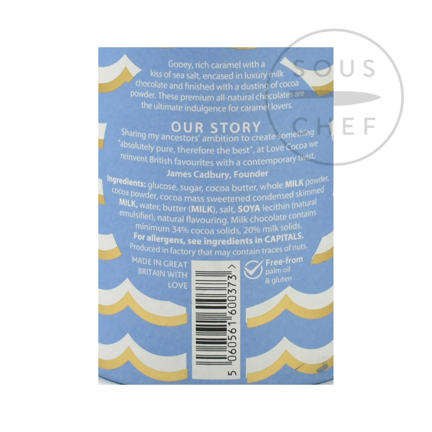 Ingredients: Glucose, sugar, cocoa butter, whole milk powder, cocoa powder, cocoa mass, sweetened condensed skimmed milk, water, butter (milk), salt, (emulsifier) soy lecithin, natural flavouring. Milk chocolate contains min. 34% cocoa solids, min. 20 % milk solids. Made in a factory which handles nuts, seeds, soya and milk. Allergens listed in bold.