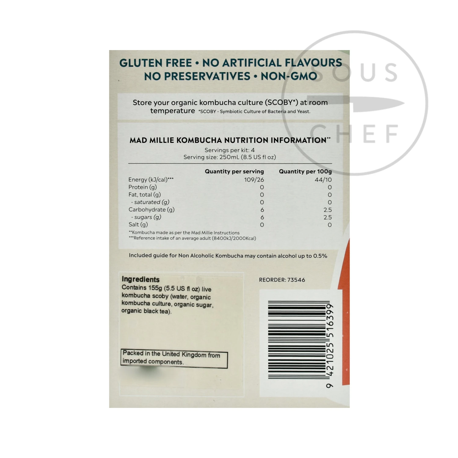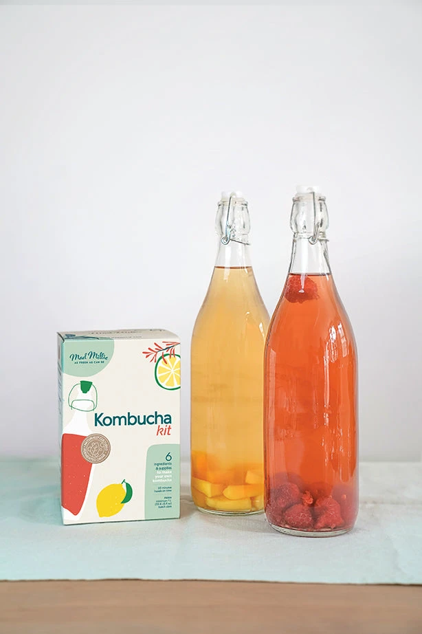 Kit contents: 1L glass jar, metal closure lid, thermometer strip, organic kombucha SCOBY, muslin cloth, ‘How To’ guide.