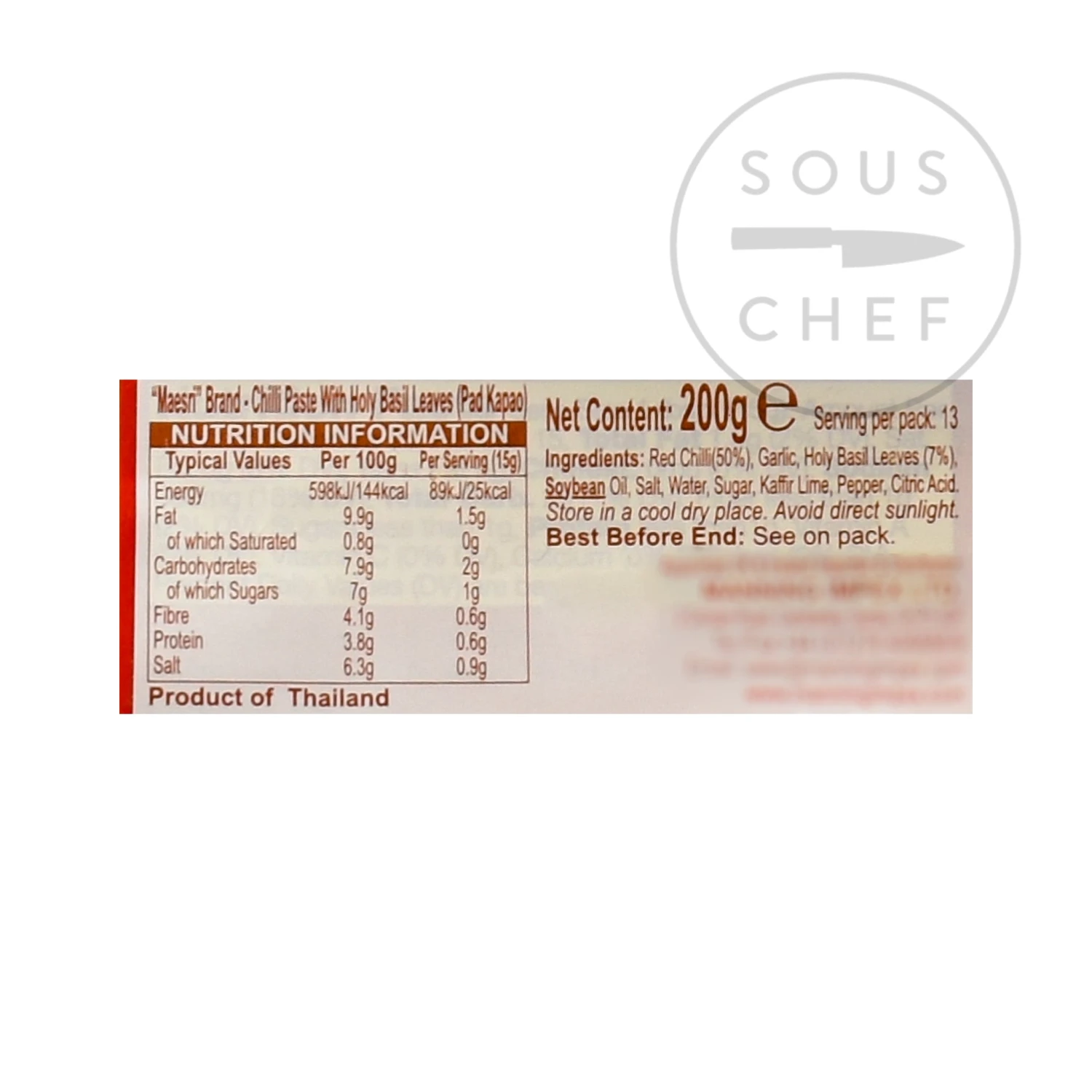 Ingredients: Fresh red chilli 50%, garlic 21%, basil leaves 7%, soybean oil 6%, salt 6%, water 5%, sugar 3%, kaffir lime 1%, pepper 0.8%, citric acid 0.2%