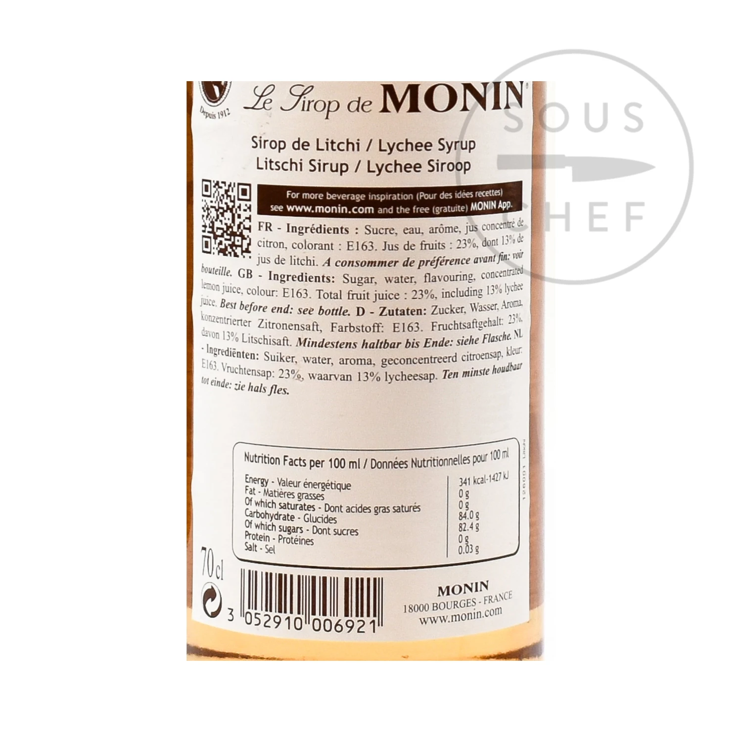 Ingredients: Sugar, water, natural lychee flavouring, concentrated lemon juice, colour: E163. Total fruit juice: 15%, including 10% lychee juice.