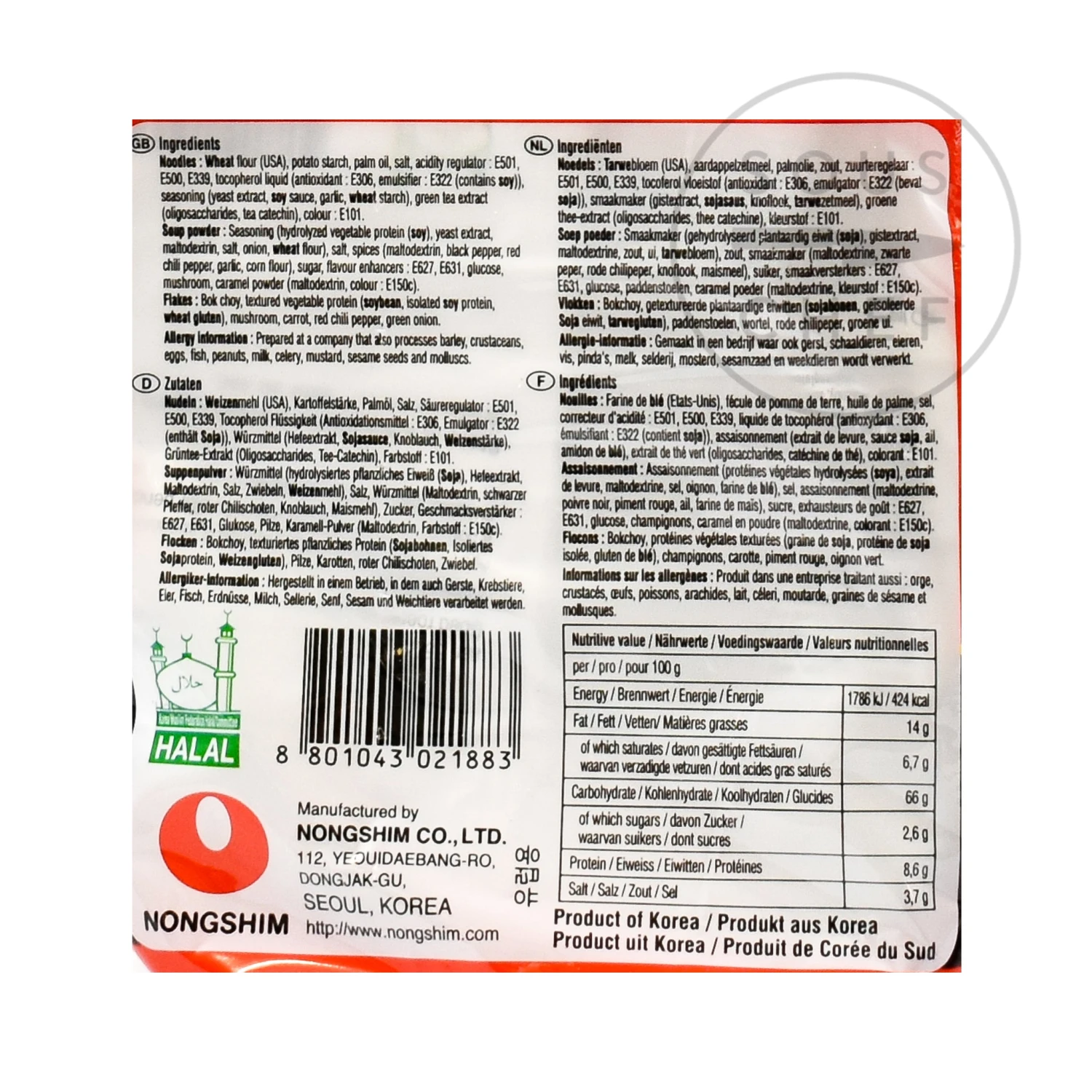 Ingredients (noodles):Â wheat flour, potato starch, palm oil, salt, acidity regulators: E501, E339, E500, tocopherol liquid (antioxidant: E306, emulsifier: E322), seasoning (yeast extract, soy sauce, garlic, wheat starch), green tea extract (oligosaccharides, tea catechin, acid: E330), colour: E101. Ingredients (soup powder):Â seasoning (hydrolysed vegetable protein [soy], maltodextrin, yeast extract, salt, garlic, onion, wheat flour), salt, spices (maltodextrin, black pepper, red chili pepper, garlic), sugar, glucose, flavour enhancers: E631, E627, mushroom. Ingredients (flakes):Â green onion, mushroom, bok choy, carrot, red chili pepper.Â
