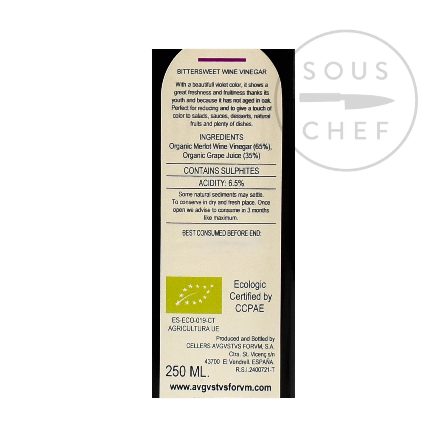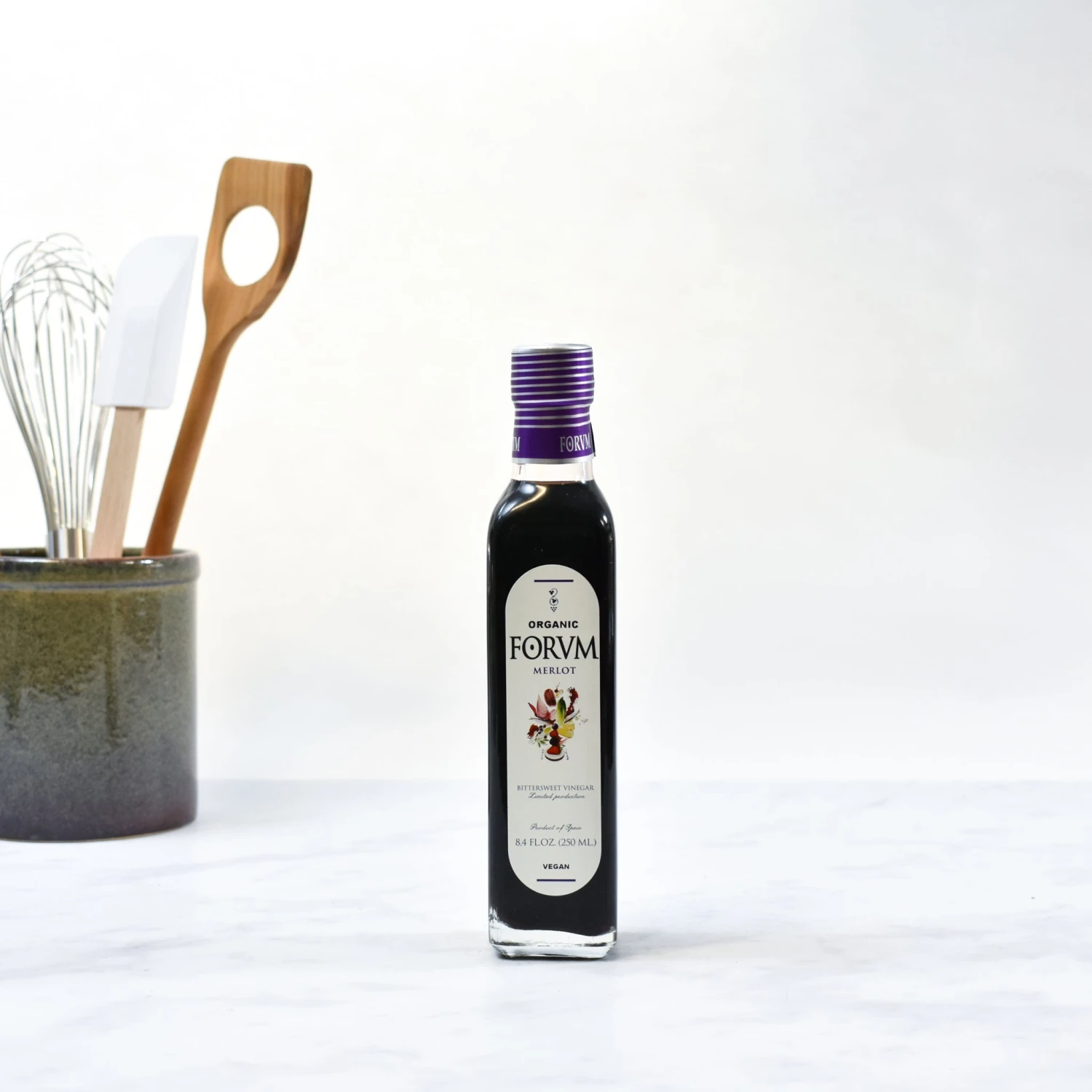 Forum, Forvum or Forvm merlot vinegar is a fruity, bittersweet Catalan vinegar made from young merlot wine. Unlike Forvm’s other vinegars, the merlot vinegar has not been aged in oak casks and contains 35% grape juice, which gives sweeter, more rounded flavours. The intense red-violet hue gives a vibrant touch of colour to salads. The red fruit flavours also work well with desserts – use the vinegar in a sweet reduction and drizzle over fresh fruit salads or red berry cheesecake.