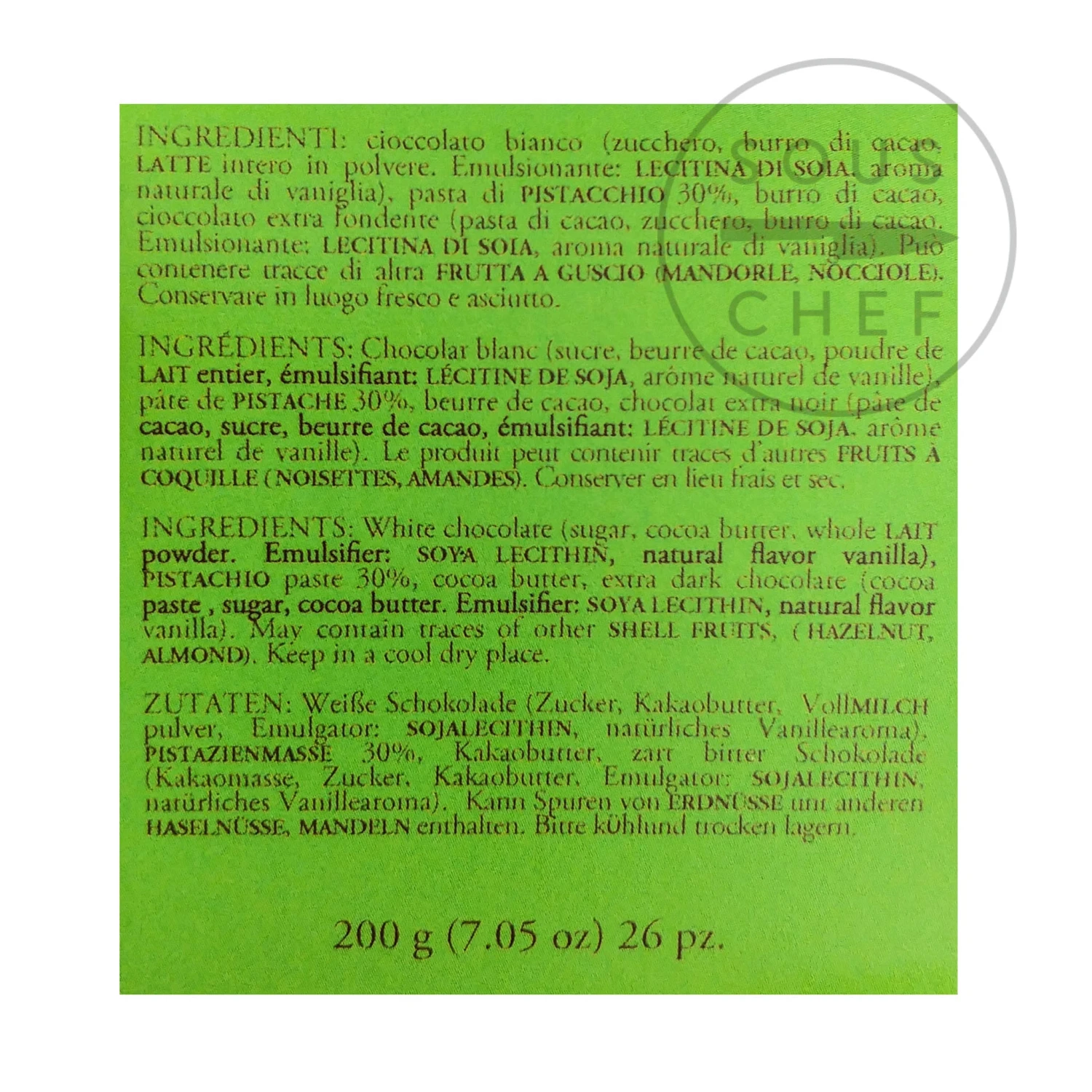 Ingredients: white chocolate (sugar, cocoa butter, whole milk powder, emulsifier: soya lecithin, natural flavour: vanilla), pistachio paste (30%), cocoa butter, extra dark chocolate (cocoa paste, sugar, cocoa butter, emulsifier: soya lecithin, natural flavour: vanilla). Contains allergens: nuts, milk, soya.