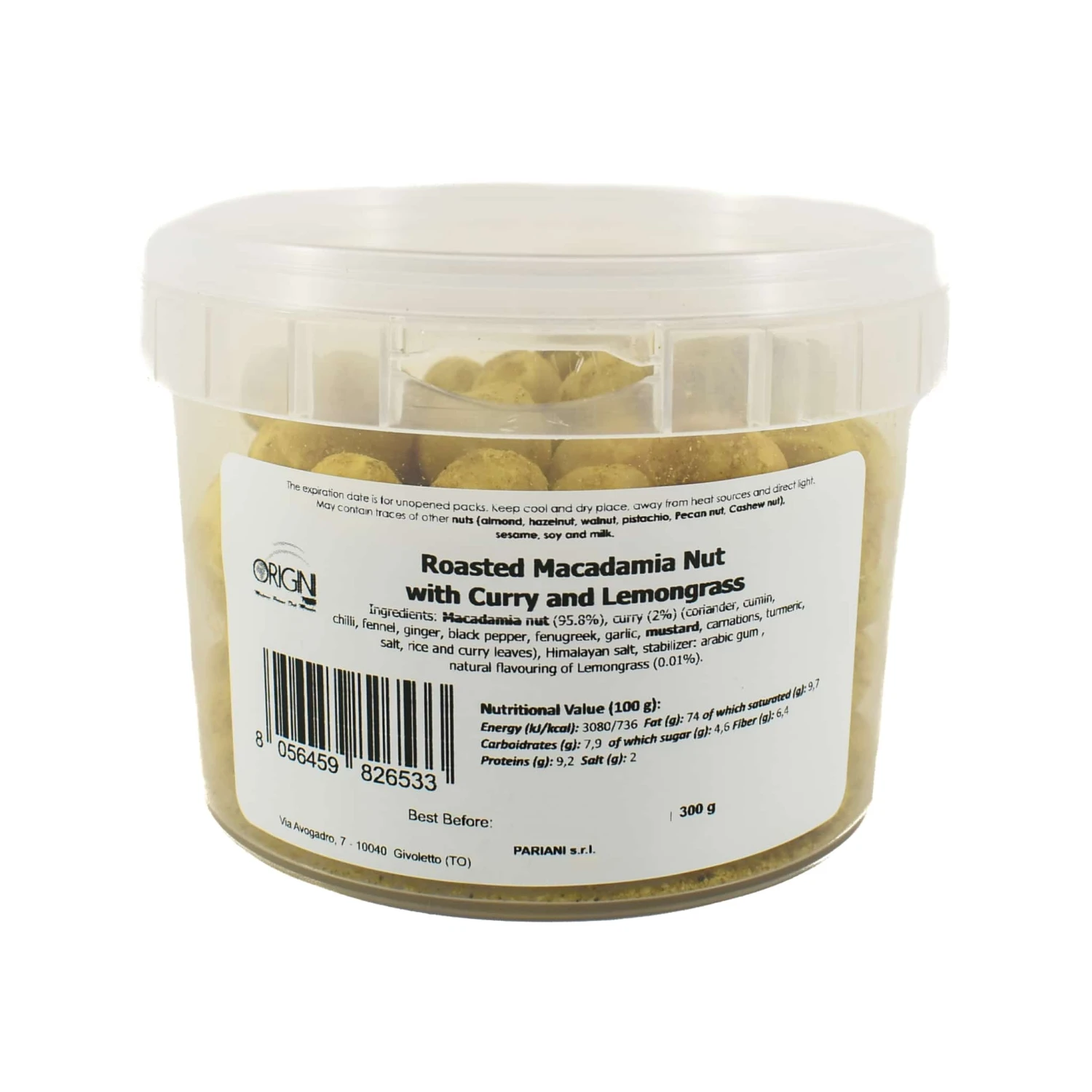 Ingredients: Macadamia nut (95.8%), curry (2%) (coriander, cumin, chilli, fennel, ginger, black pepper, gunugreek, garlic, mustard, carnations, turmeric, salt, rice and curry leaves), Himalayan salt, stabiliser: arabic gum, natural flavouring of lemongrass (0.01%)