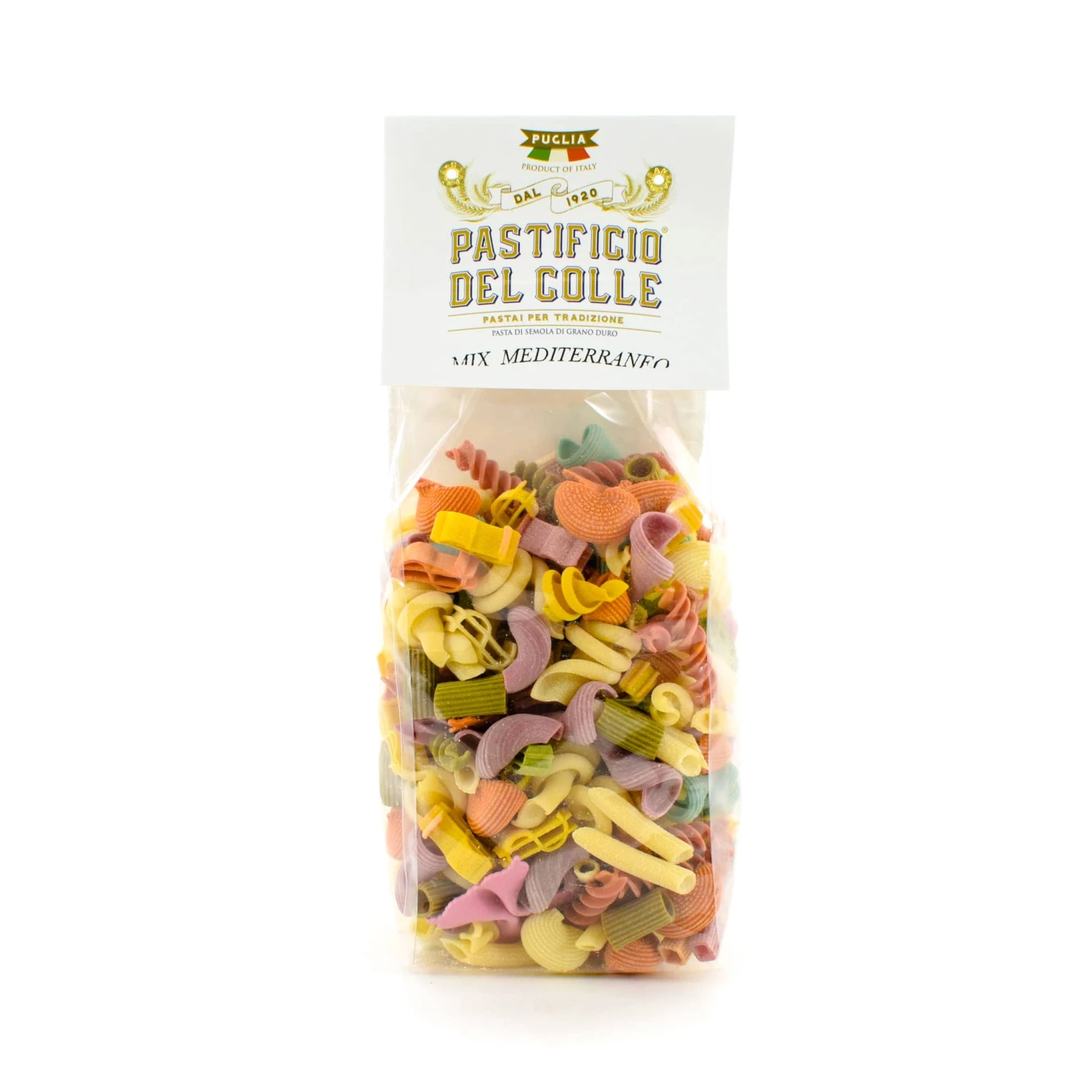 Pastificio Del Colle’s “pick and mix” bronze die pasta is an eclectic mix of shapes, colours and sizes. Including bow ties, spirals, ribbons and shells, every mouthful is guaranteed to be different! Use it to make a pasta salad, mixed with tomatoes, olives, torn mozzarella and other favourite Italian flavours.