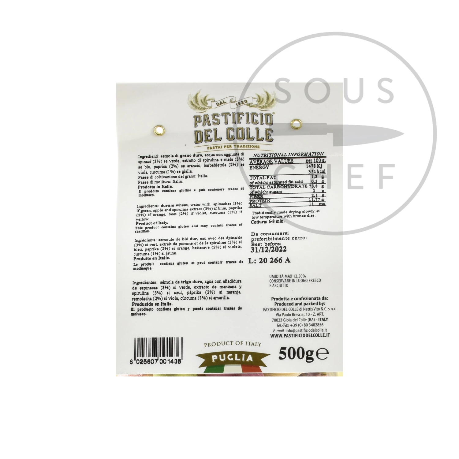 Pastificio Del Colle is based in sunny Puglia, and has been making pasta for 100 years. In recent years, Pastaficio Del Colle has become known for its beautiful coloured pasta shapes, which are all made using natural dyes. The company uses traditional artisan methods – shaping their pasta with bronze dies, selecting the best durum wheat semolina, and allowing the pasta to dry slowly. The company was started by Vito Nettis in 1920, and is now run by his nephew who is also called Vito Nettis!