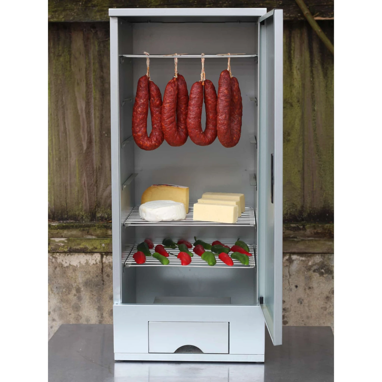 - ProQ Cold Smoking Cabinet – with shelving and space for hooks. This spacious chamber contains all the smoke while you create your signature smoked ingredients. Made from galvanised steel, it is lightweight, durable and weatherproof. Has enough space to smoke 2-3kg of cheese, or hang several whole sides of salmon.
