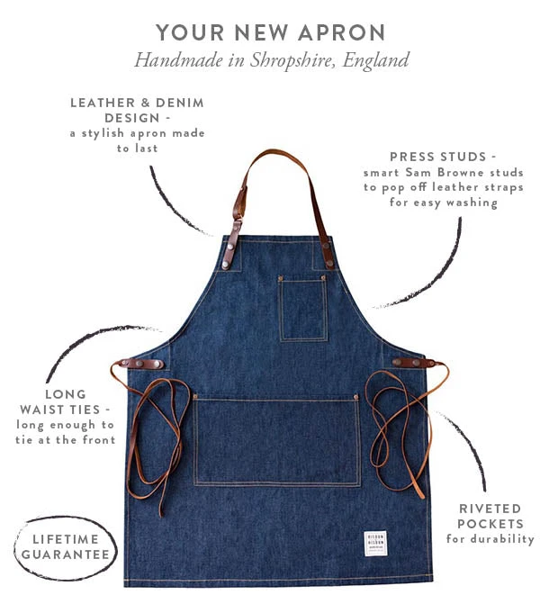 Each apron has a lifetime guarantee against faults in workmanship and materials. The leather waist straps are extra long and fine so you can tie them back around the front. And the leather neck strap is adjustable so everyone will have the perfect fit.
