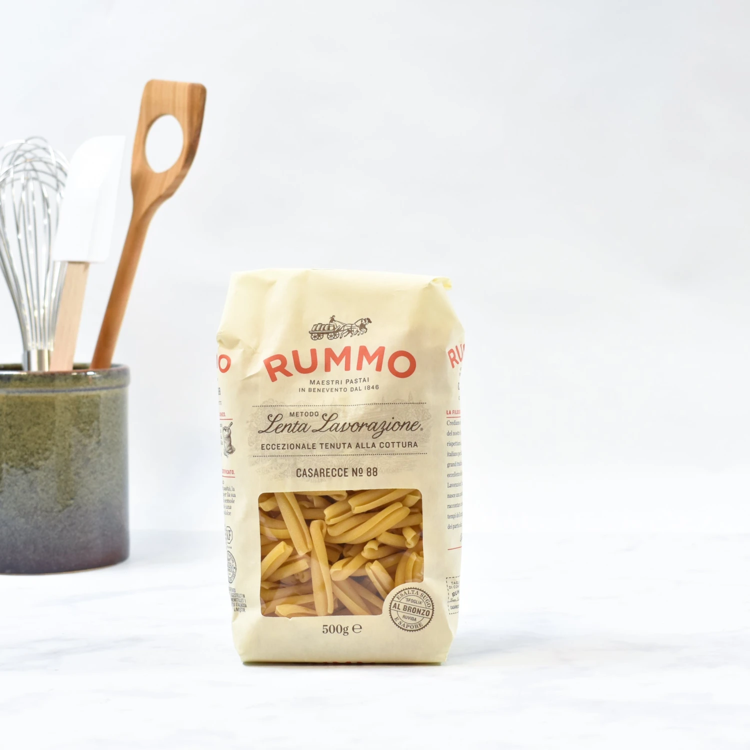Enjoy Rummo casarecce pasta with a robust sauce. Casarecce pasta originated from Sicily, but is now served across Southern Italy. We love it with Italian sausage, cream and spinach. Or enjoy in casseroles or tossed with roasted vegetables and olive oil. Rummo casarecce pasta cooks in 9 minutes.