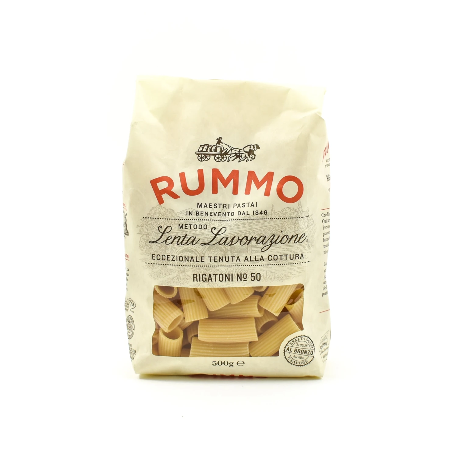 Rummo rigatoni no. 50 ridged pasta tubes are the perfect partner for ragu or sausage meat sauces, as well as for pasta bakes. The ridges on the outside of the tubes are an ideal surface for thinner sauces to cling onto as well, like a classic tomato or pesto.