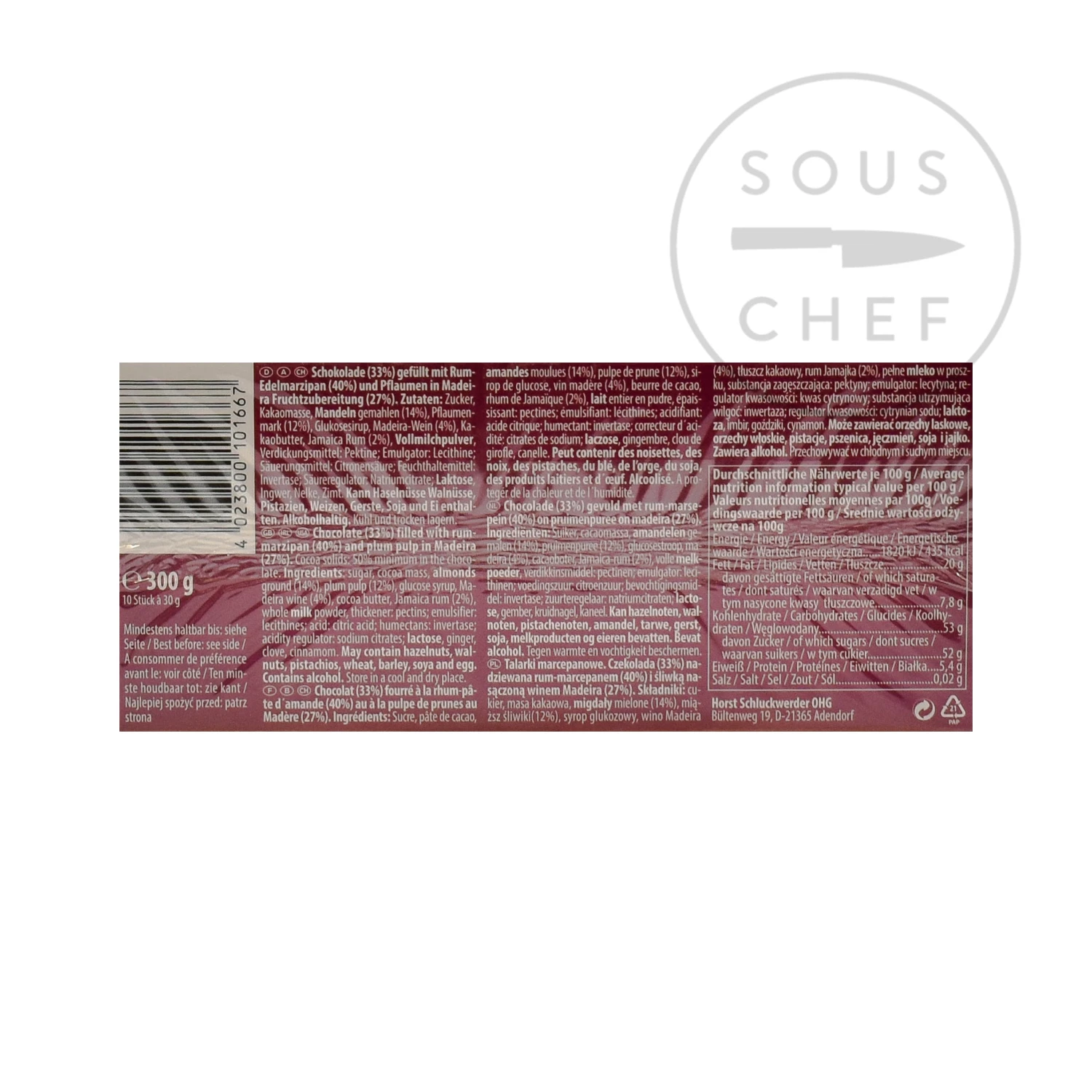 Ingredients: sugar, cocoa mass, ground almonds (14%), plum pulp (12%), glucose syrup, Madeira wine (4%), cocoa butter, Jamaica rum (2%), whole milk powder, thickener: pectin, emulsifier: lecithins, acid: citric acid, humectant: invertase, acidity regulator: sodium citrate, lactose, ginger, cloves, cinnamon. Minimum 50% cocoa solids. May contain hazelnuts, walnuts, pistachios, wheat, barley, soya and egg. Contain alcohol.