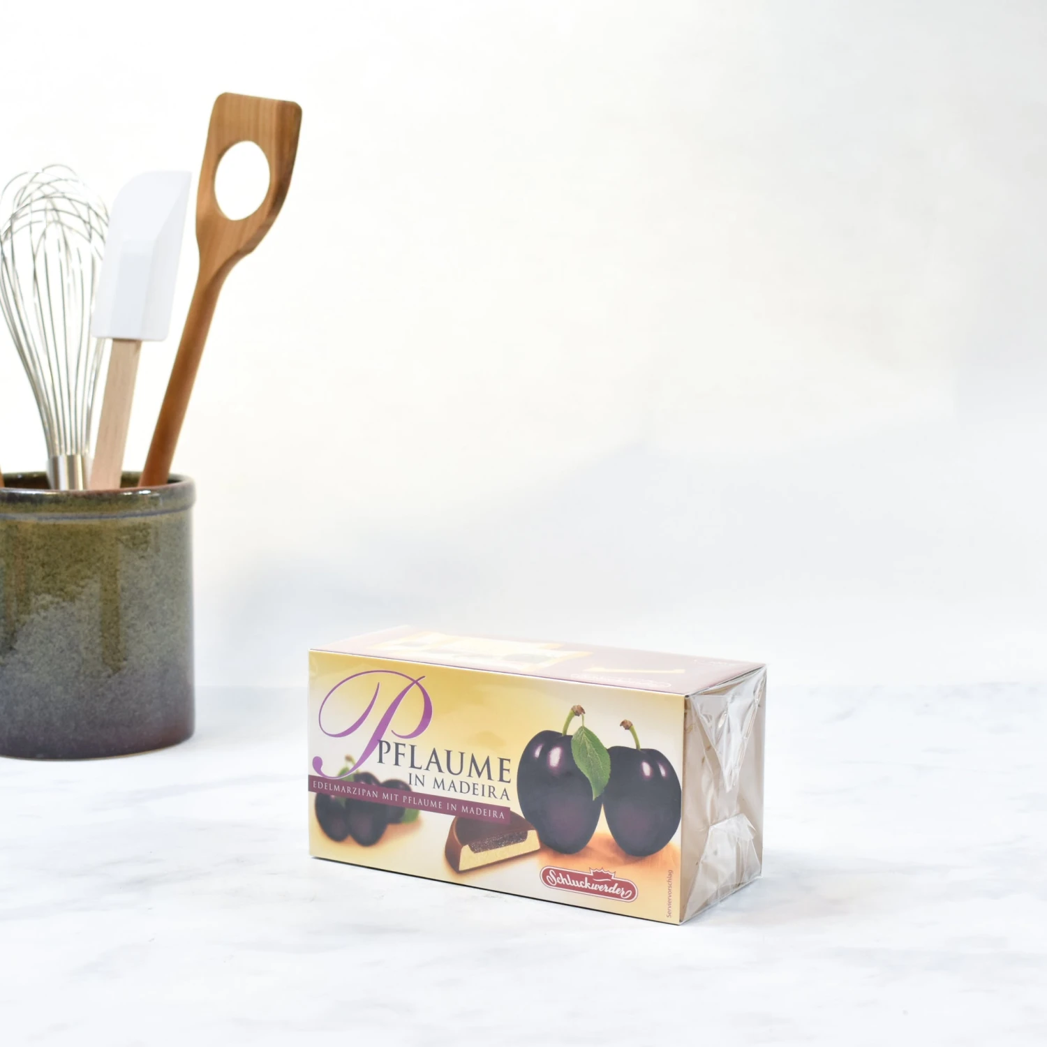 The dark chocolate discs are filled with fine German marzipan and a jam made from gently spiced plums soaked in Madeira wine. Pair with a glass of Madeira or other dessert wine, or simply with a strong coffee.