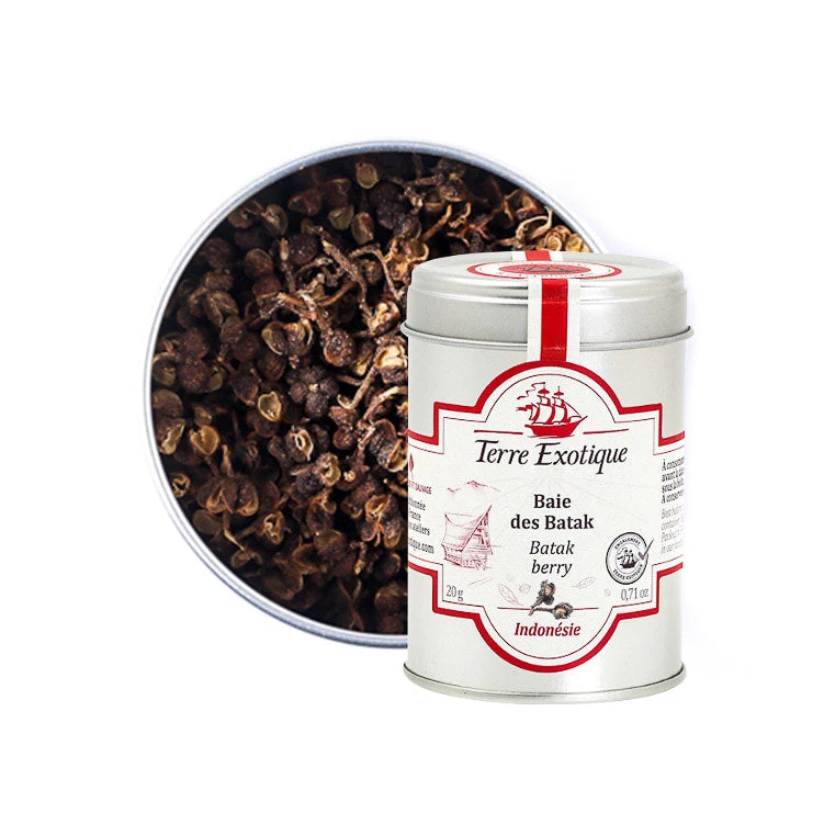 Terre Exotique’s Batak berry has heady lemon aromas – the Batak equivalent of Chinese Szechuan berry. Harvested in Indonesia by the Batak people, these berries grow in the zanthoxylum acanthopodium bush and are related to Szechuan berries. Also known as Bataks pepper, these berries are used in a traditional dish of Ikan mas arsik, made with wok-fried carps and a ginger & lemongrass sauce.