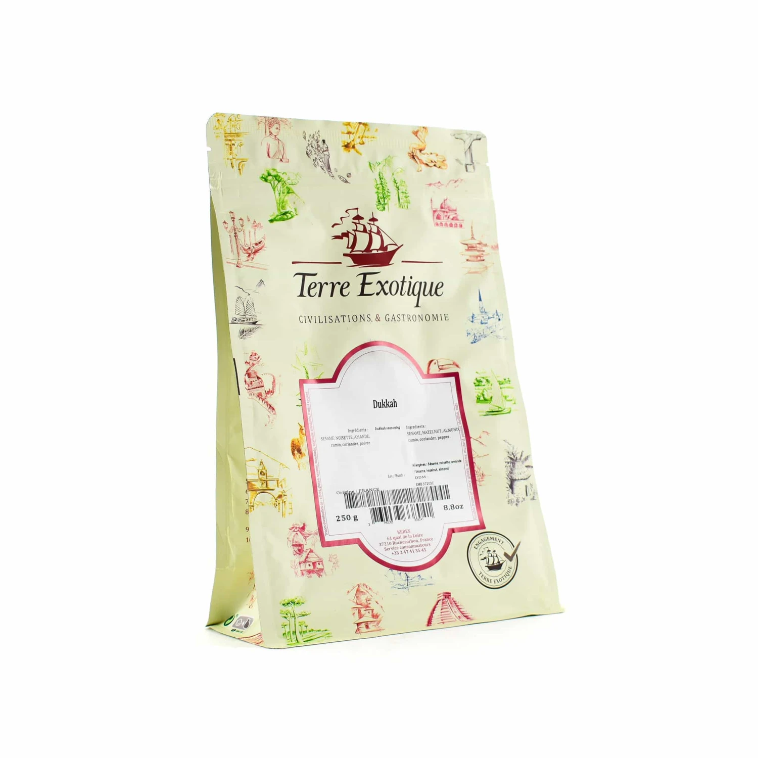 Terre Exotique’s dukkah seasoning gives a nutty flavour and gentle crunch to flatbreads and hummus. This Egyptian mix is typically served at pre-dinner drinks, where pitta breads are first dipped in olive oil, then dukkah.Â
