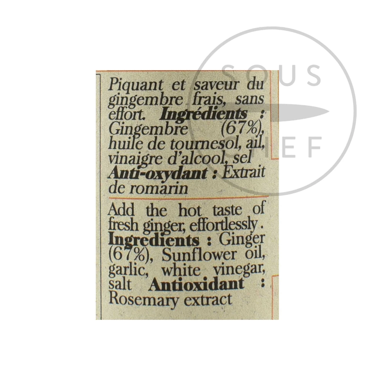 Ingredients: Ginger (67%), sunflower oil, garlic, alcohol vinegar, salt, antioxidant: rosemary extract.