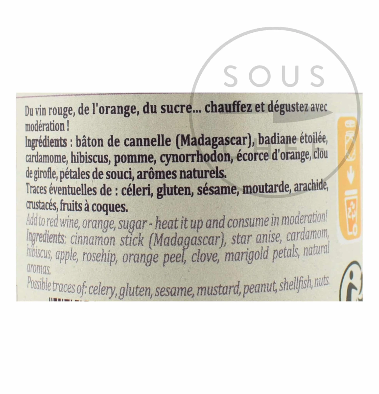 Ingredients: Cinnamon (pods) 30 %, star anise 24 %, cardamom 9%, bitter orange peel 7%, hibiscus 7%, rosehip 7%, apple 7%,cloves 6%, marigold petals 3%, natural aroma orange flavour